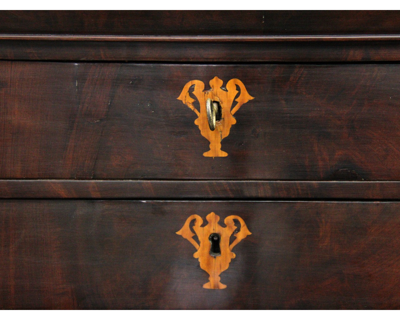 COPPIA DI PICCOLE CONSOLLE DIRETTORIO in piuma di mogano, piano in marmo e gambe a sciabola, piccola tarsia al centro dei tiretti. XIX secolo Sicilia . h cm 103 x 61 x 33,5