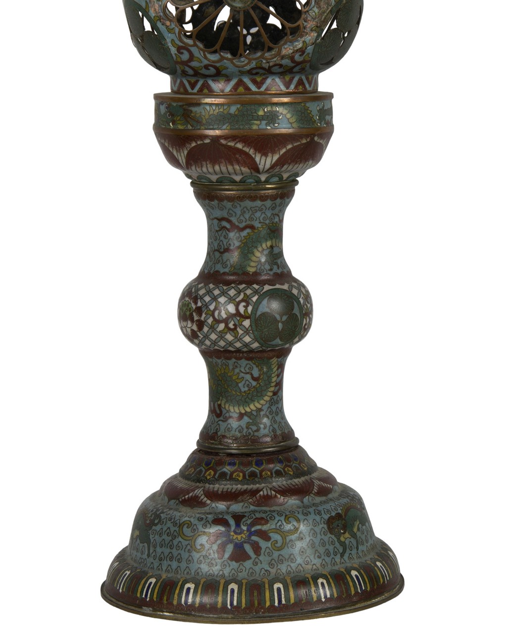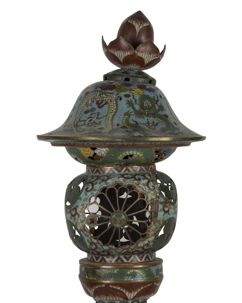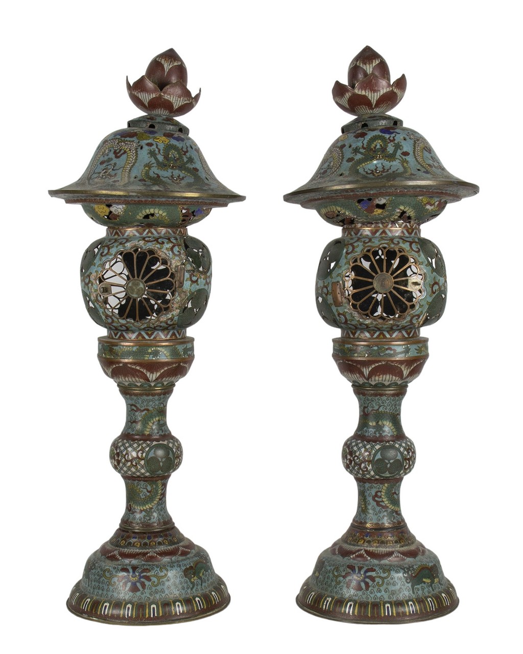 CURIOSA COPPIA DI GABBIE PORTAGRILLI in cloisonne' a forma di lampade . Cina epoca transitoria fine XVIII/primi XIX secolo, piccoli restauri ed usure del tempo. h cm 70 x 25