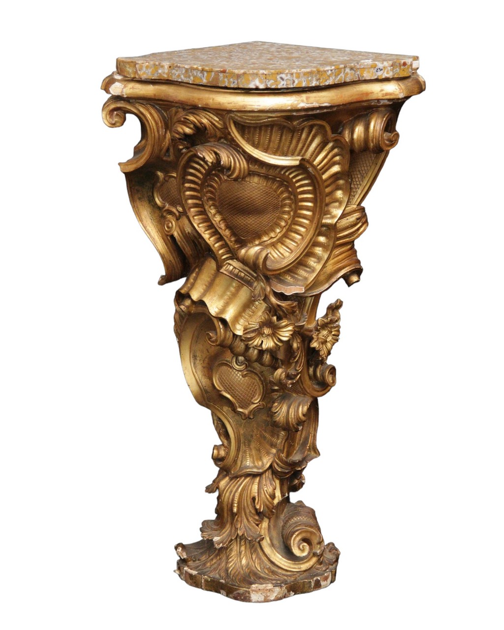 PREGIATE ANGOLIERE LUIGI XV in legno riccamente intagliato e dorato piano in diaspro di Sicilia . XVIII secolo Sicilia. h cm 89 x 51 x 45