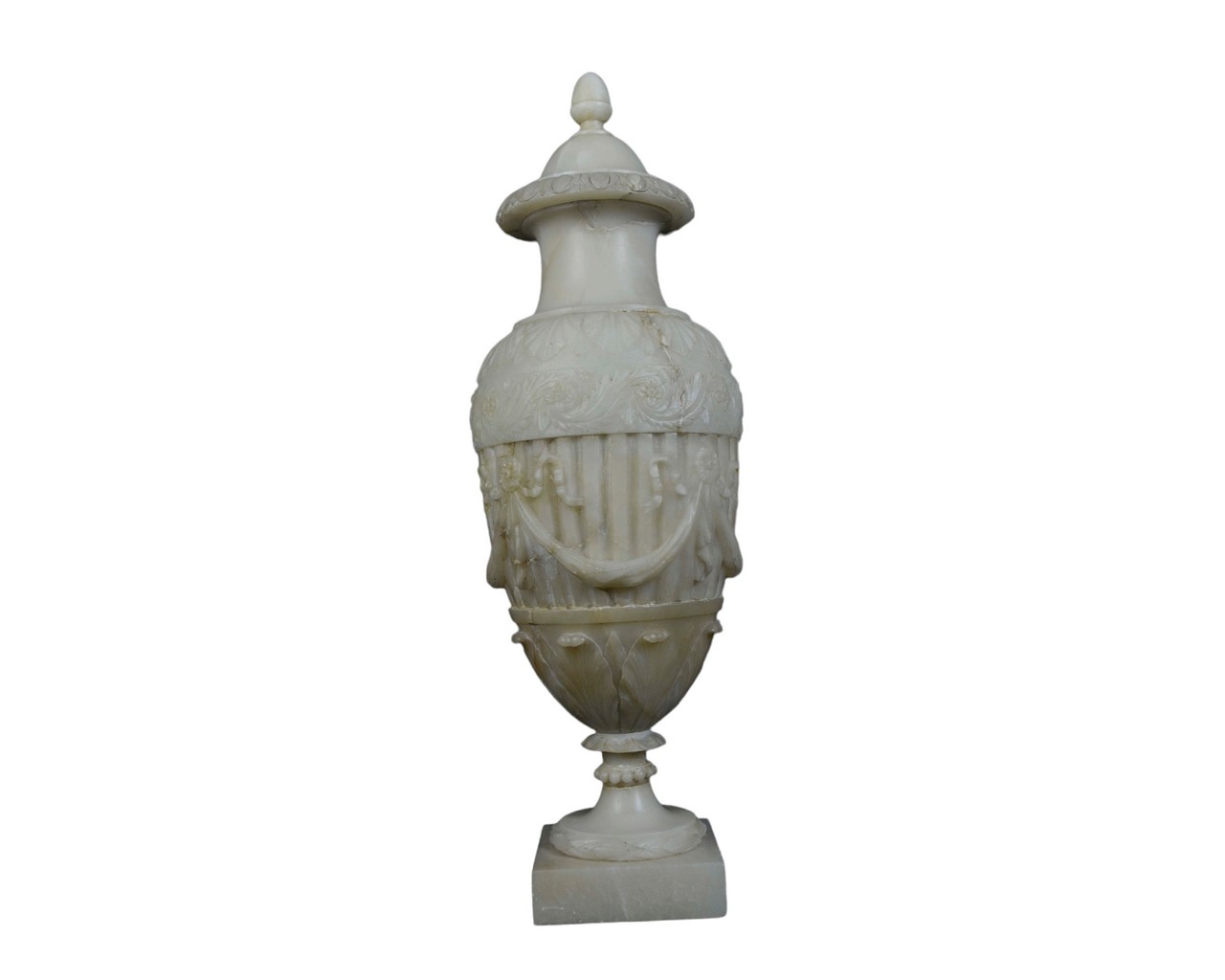 COPPIA VASI in alabastro di Volterra finemente intagliati a motivi floreali e festoni. Luigi XVI Volterra 1780-1810 circa .h cm 57 x 19