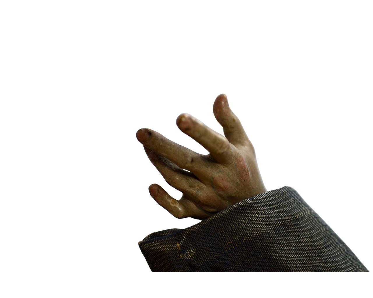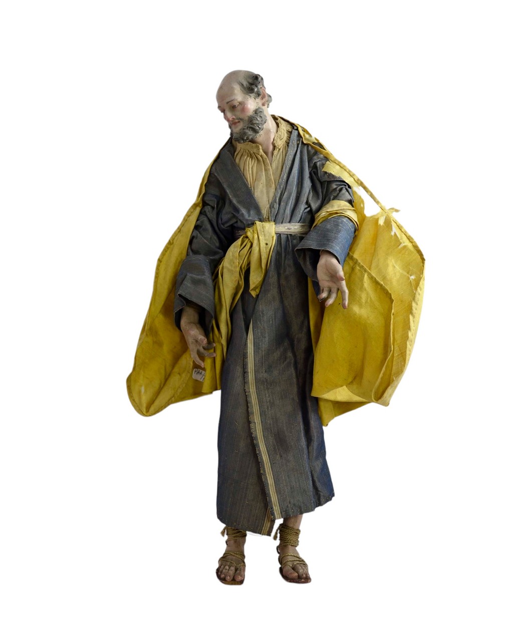 STATUETTA DA PRESEPE Raffigurante S. Giuseppe in terracotta , arti lignei ed abiti d’epoca. XVIII secolo Napoli. h cm 32