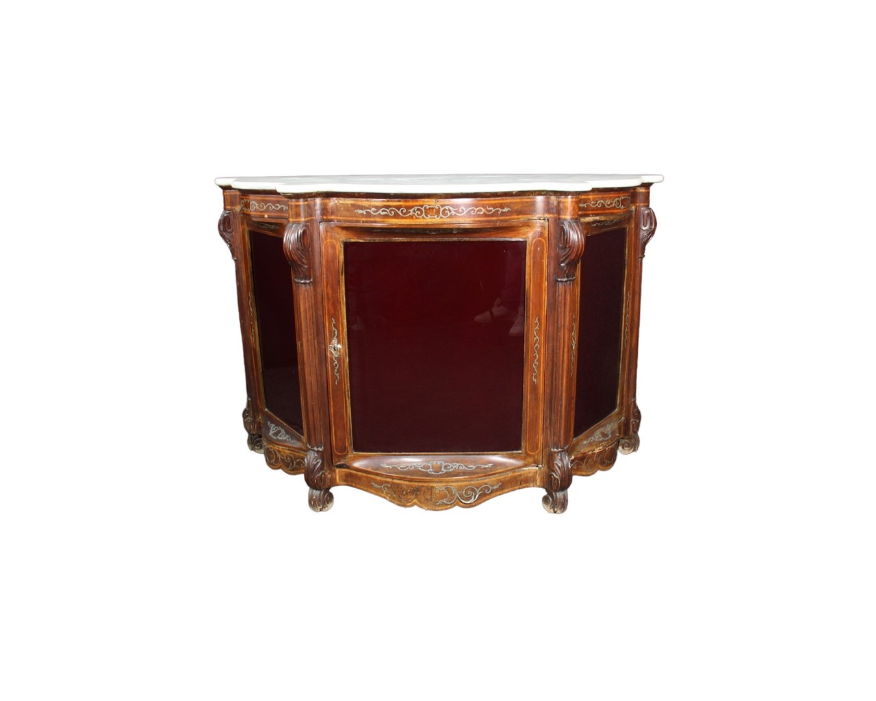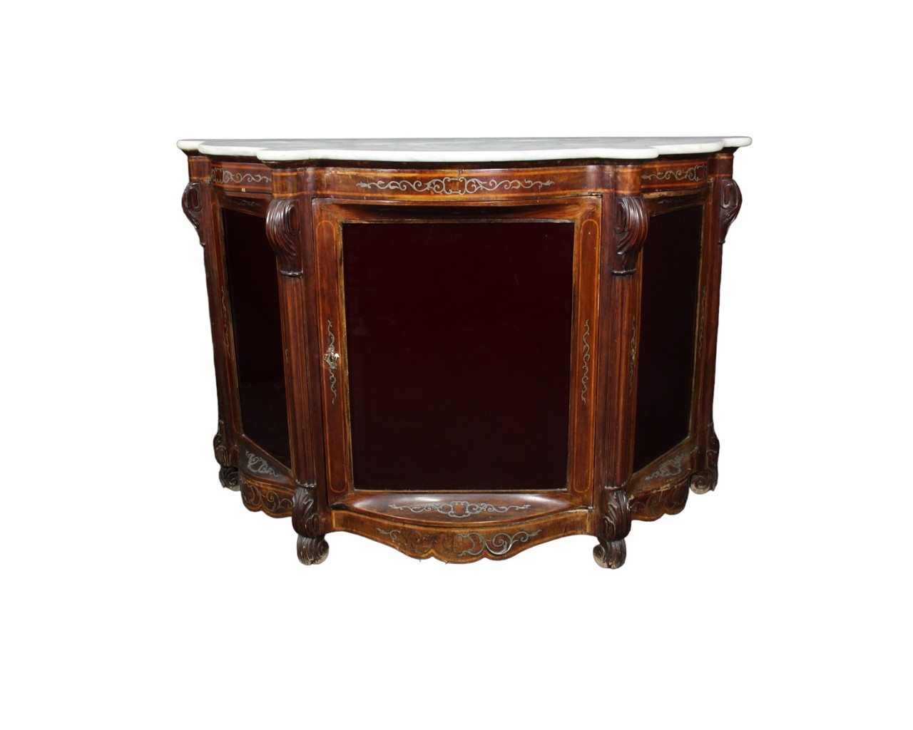 ETANGERE in legno di palissandro, arricchita da tarsie in metallo, piano in marmo bianco di Carrara Sicilia XIX secolo. usure del tempo e mancanze. h cm 102 x 153 x 61