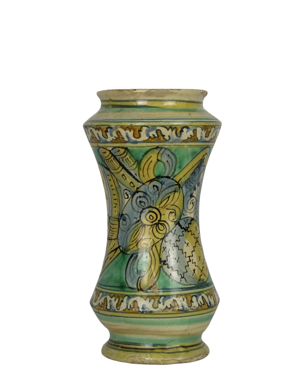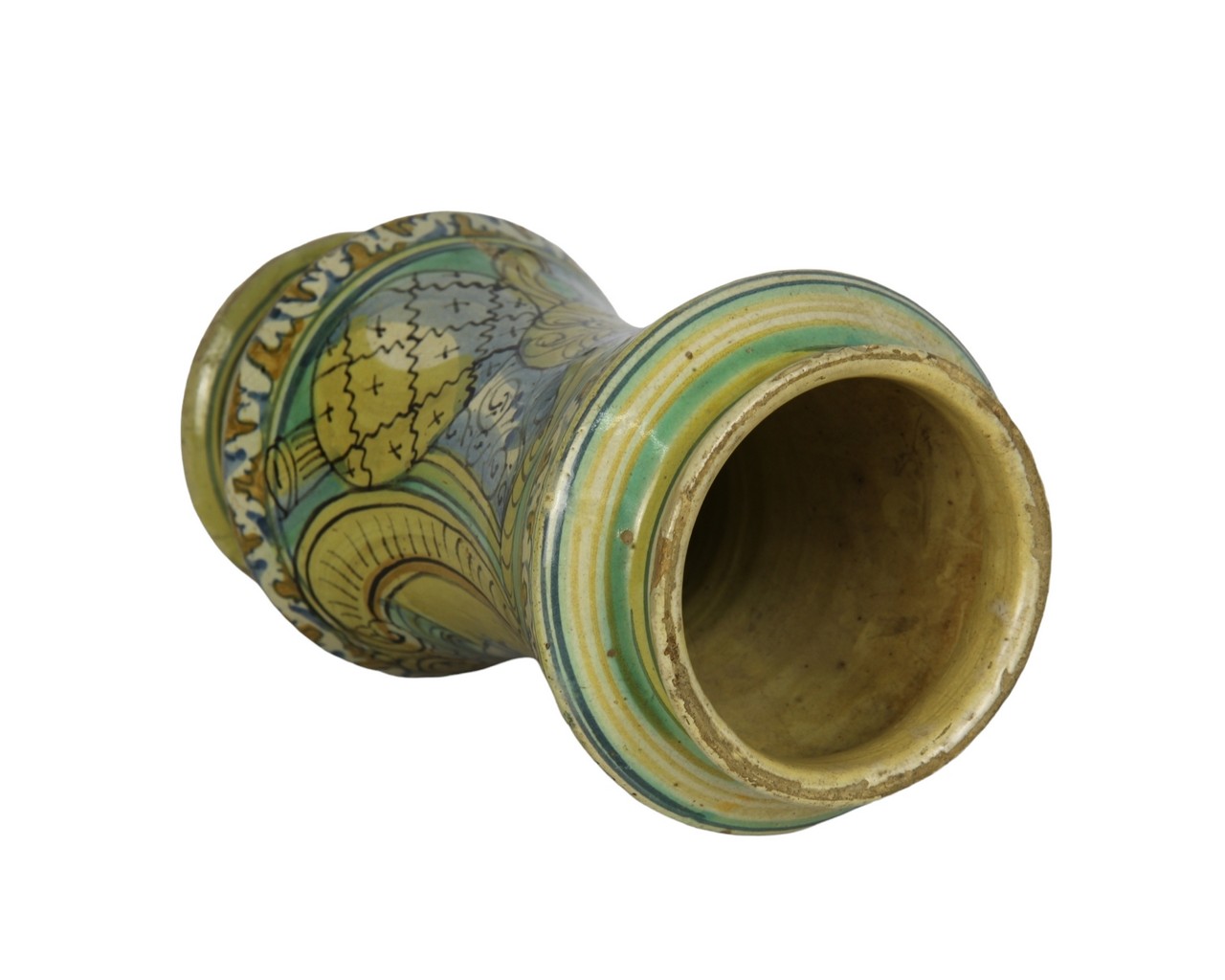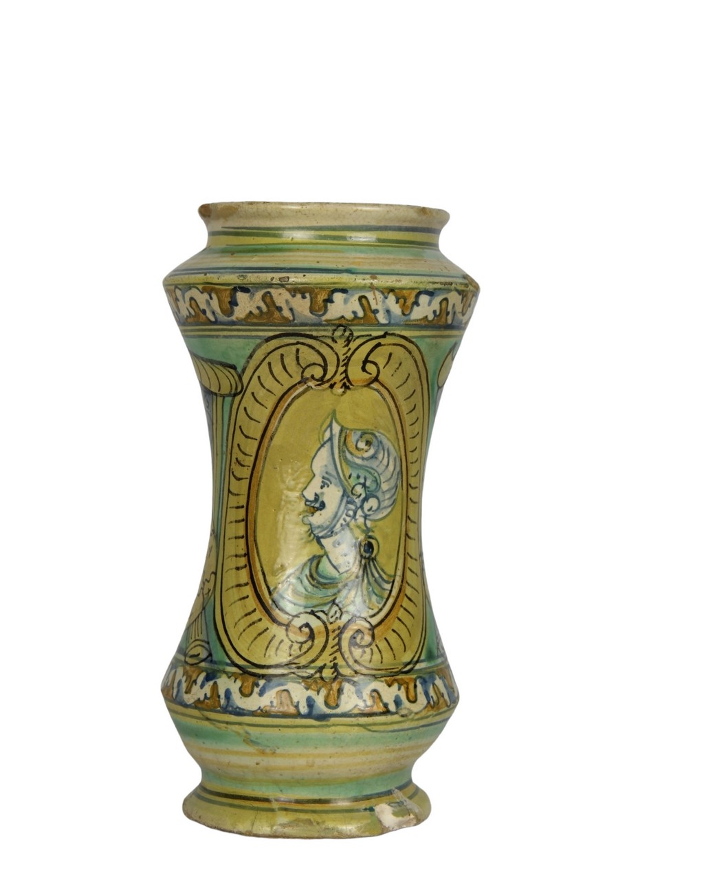 ALBARELLO in maiolica, decorato sul fronte da profilo virile. Sciacca XVII secolo. h cm 26,5 x D 14
