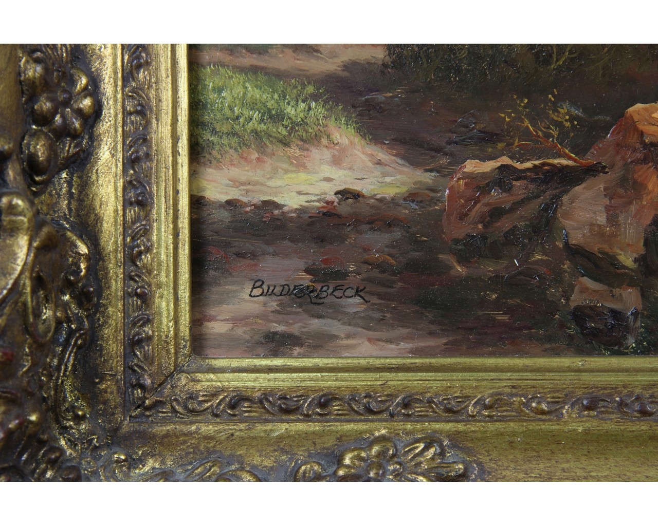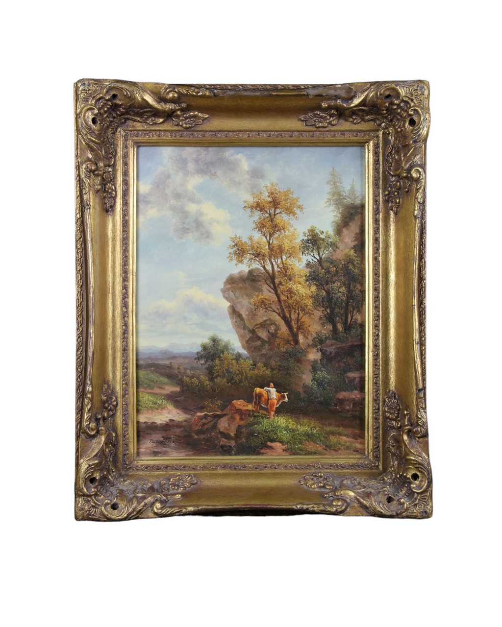 OLIO SU TELA raffigurante paesaggio campano con mucca e pastore , firmato Bilder Beck dentro cornice in legno dorata . h cm 40 x 30
