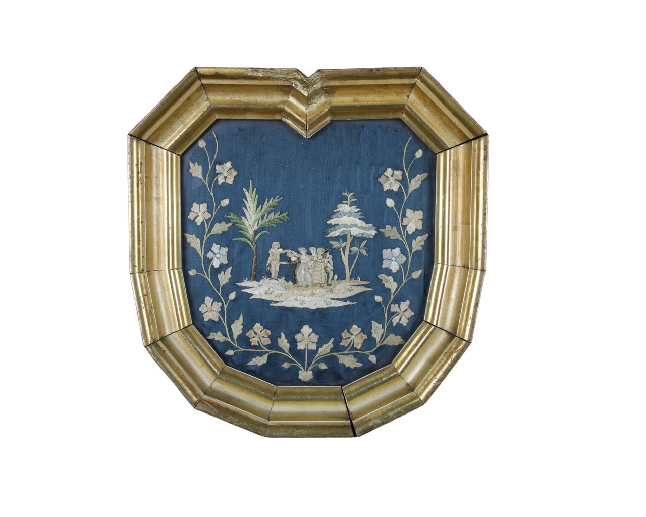 RICAMO SU RASO raffigurante scena di danza, entro decoro floreale, cornice coeva sagomata . XIX secolo manifattura siciliana . h cm 30 x 29