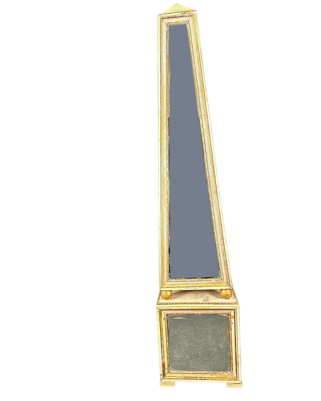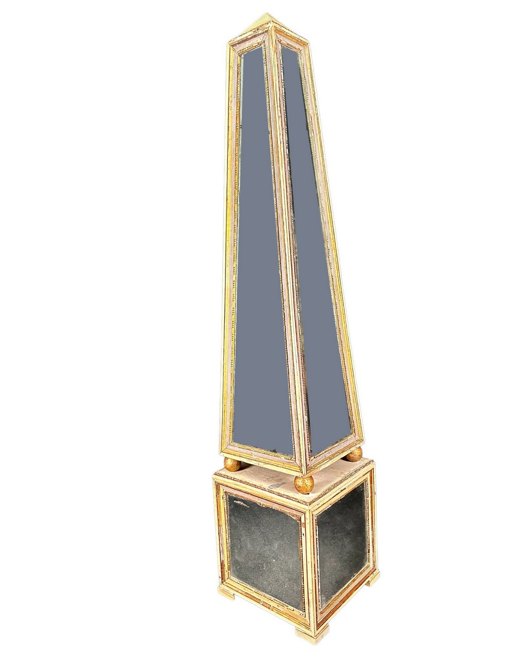 COPPIA DI ELEGANTI E DECORATIVI OBELISCHI in legno laccato e dorato ad argento e mecca con applicazioni in specchio , manifattura siciliana. fine XIX secolo . h cm 240 x 50 x 50