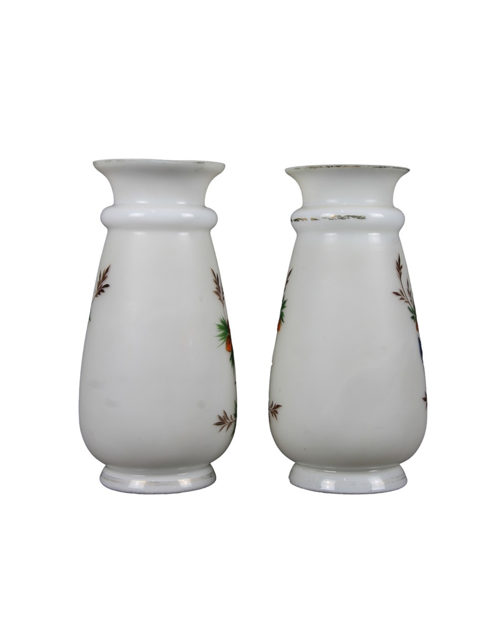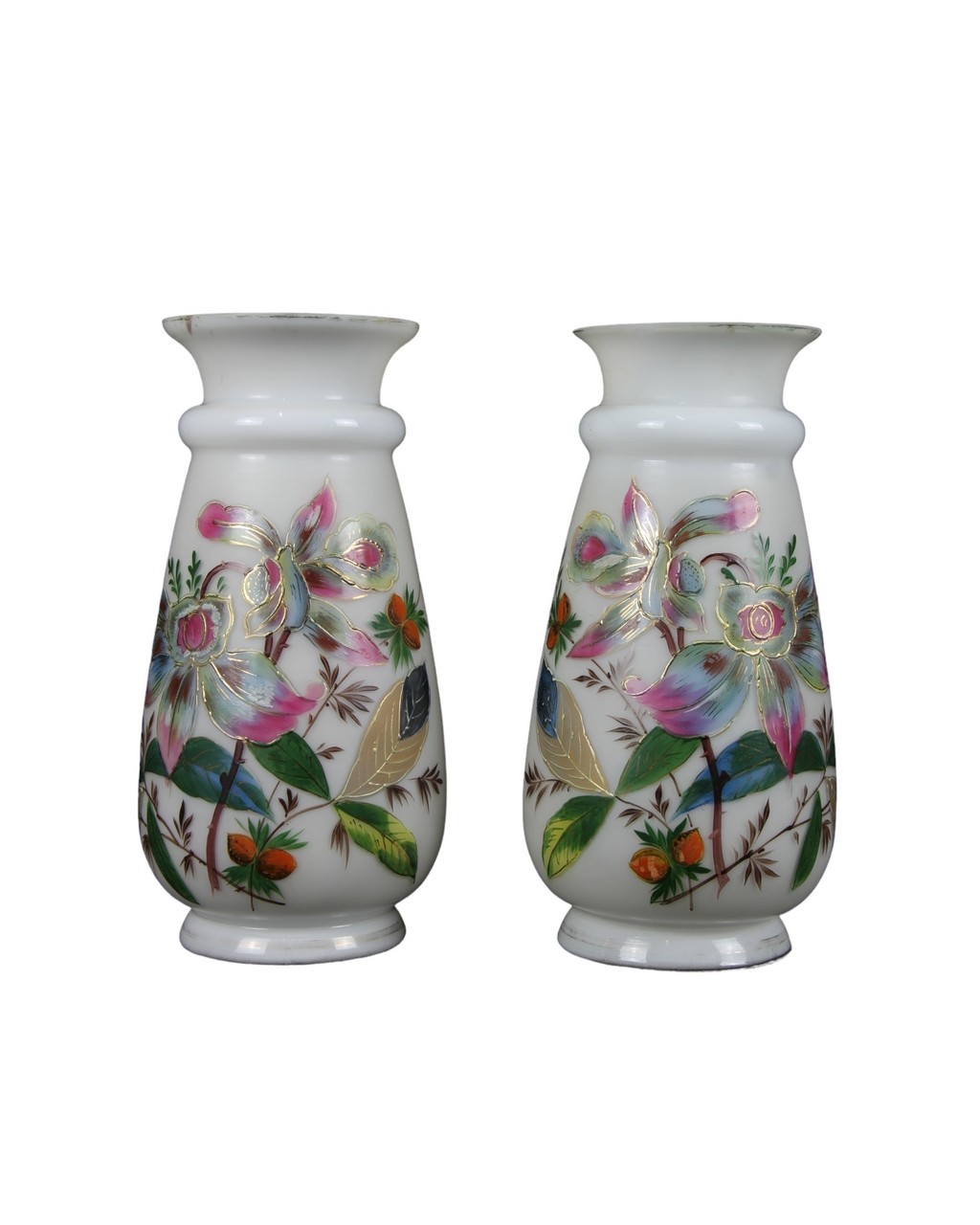 COPPIA DI VASI in opaline dipinti a motivi floreali. Inghilterra fine 800 . h cm 22,5 X 11