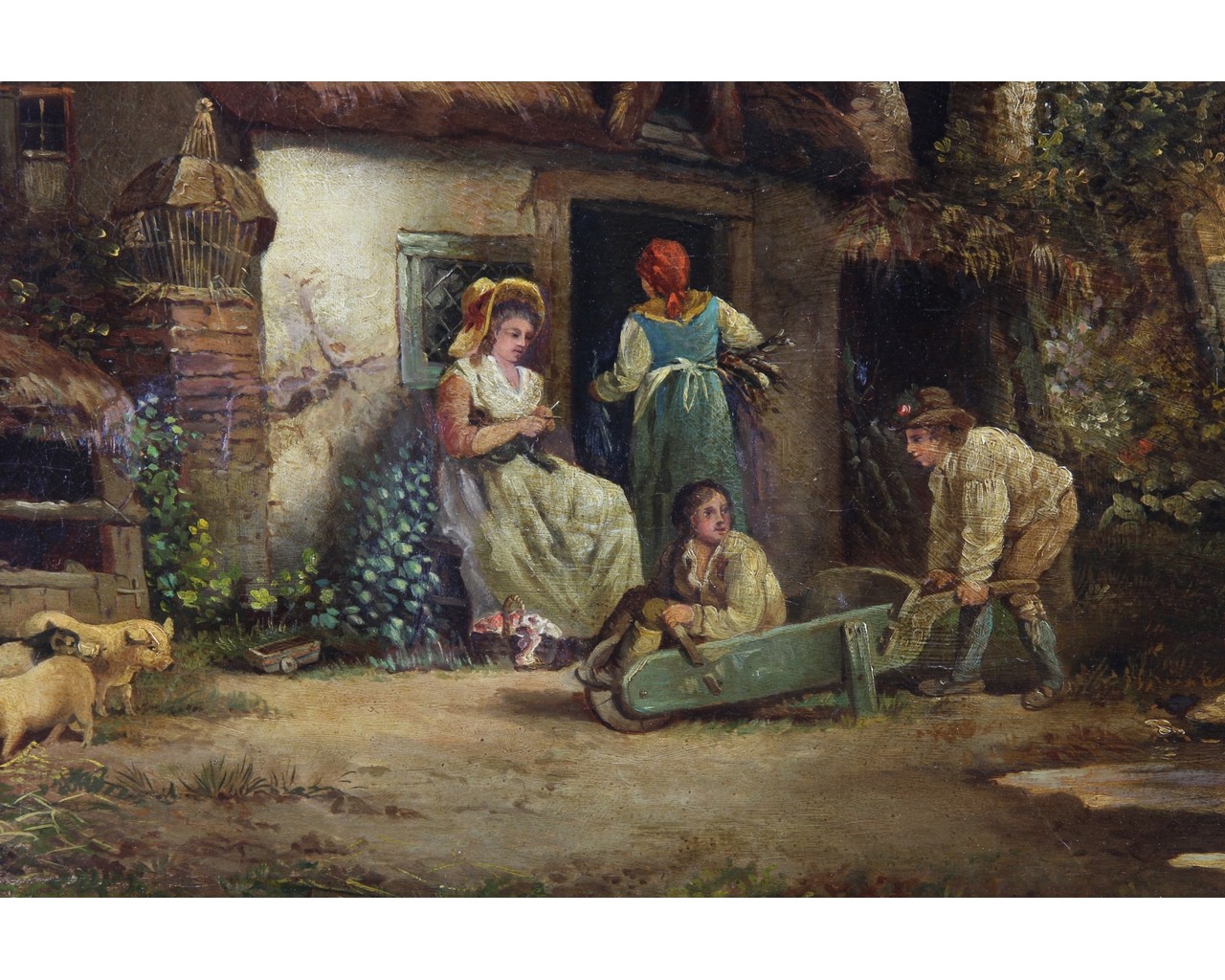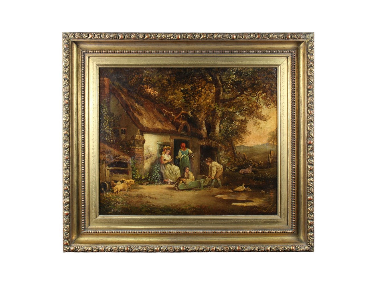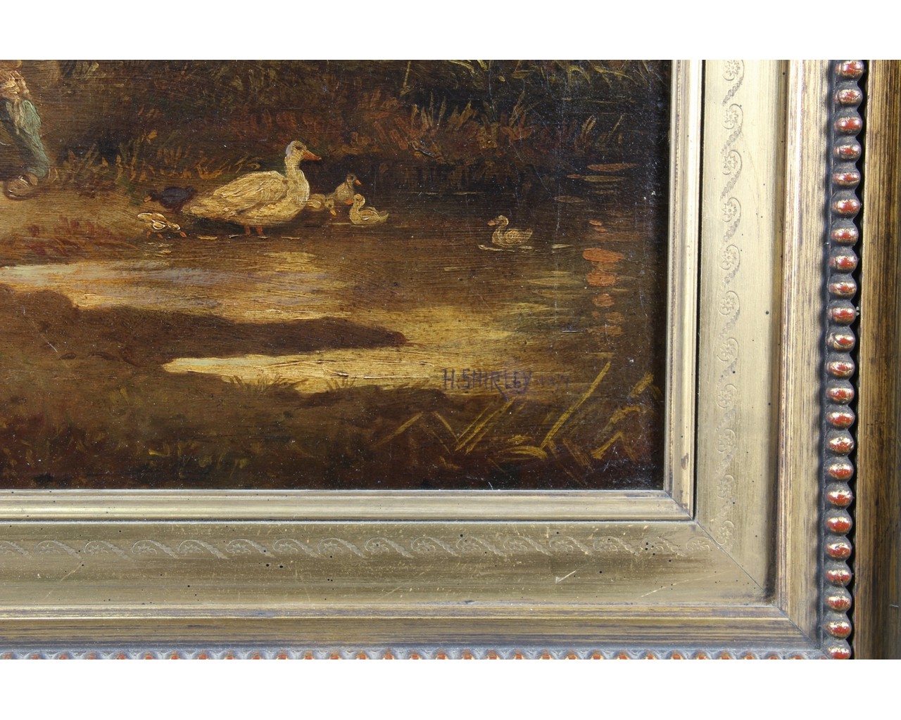 OLIO SU TELA raffigurante scena di vita contadina a firma H.Shirley 1871 , entro cornice , in legno dorata. h cm 63 X 73,5 /cornice h cm 87 X 98