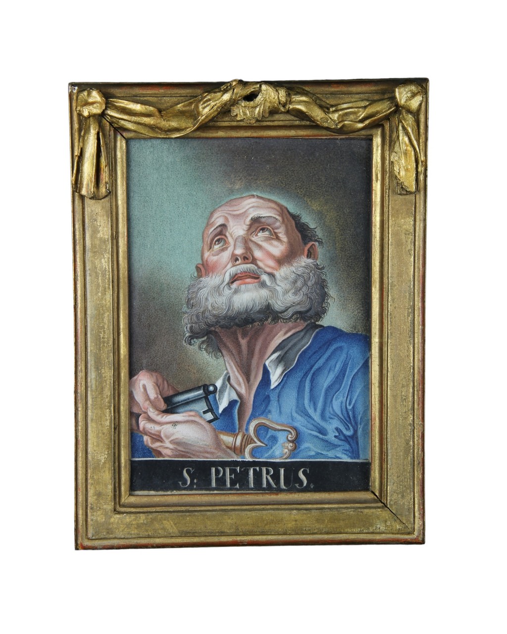 TEMPERA SU CARTONCINO raffigurante San Pietro dentro bella cornice in legno dorata e intagliata, scuola Veneta XVIII secolo. h cm 24,5 x 18
