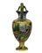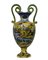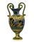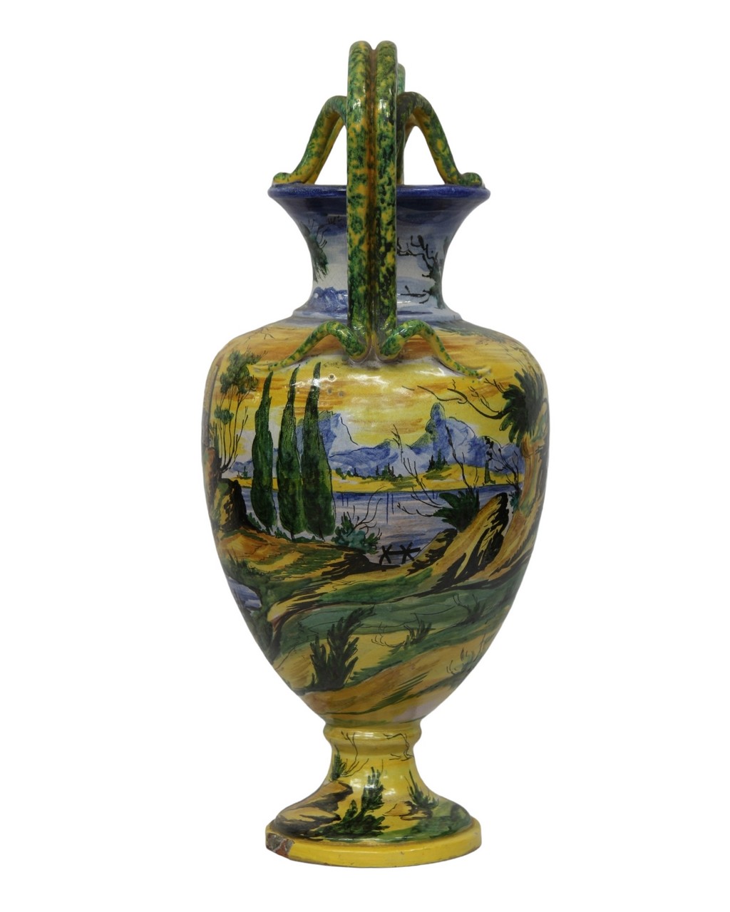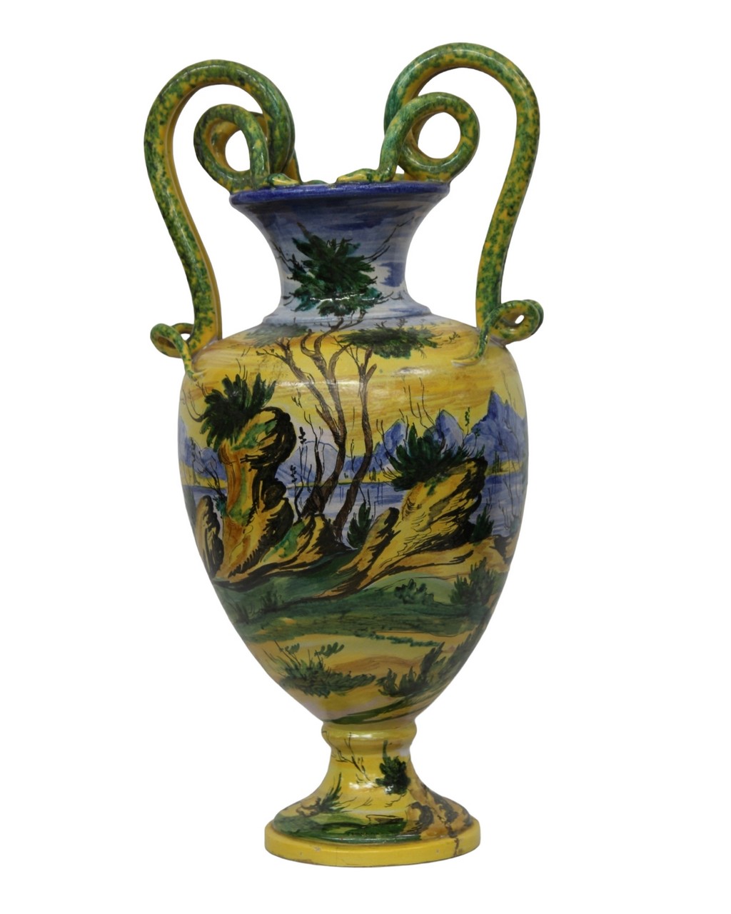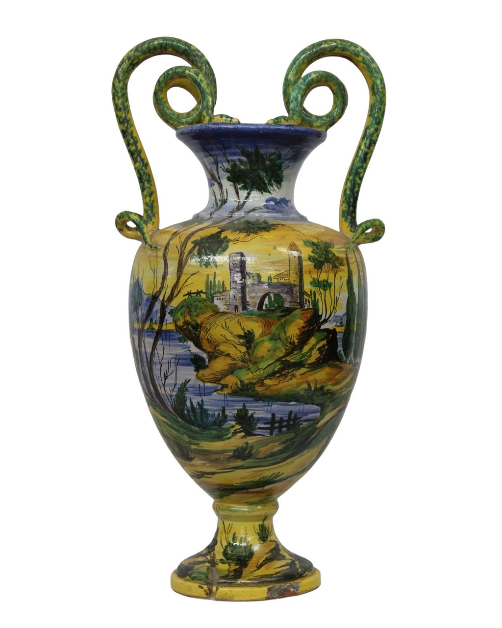 VASO in maiolica policroma biansato con manici a forma di serpenti decorato a tutto tondo, raffigurante paesaggio lacustre con castello, incollaggi alla base. Napoli XIX secolo. h cm 69 x 34