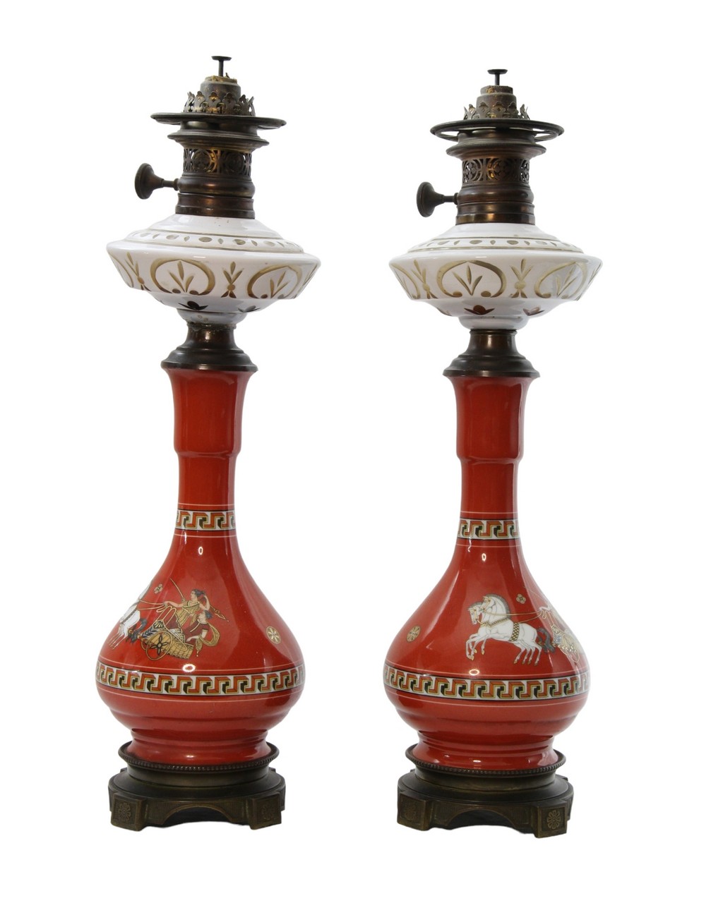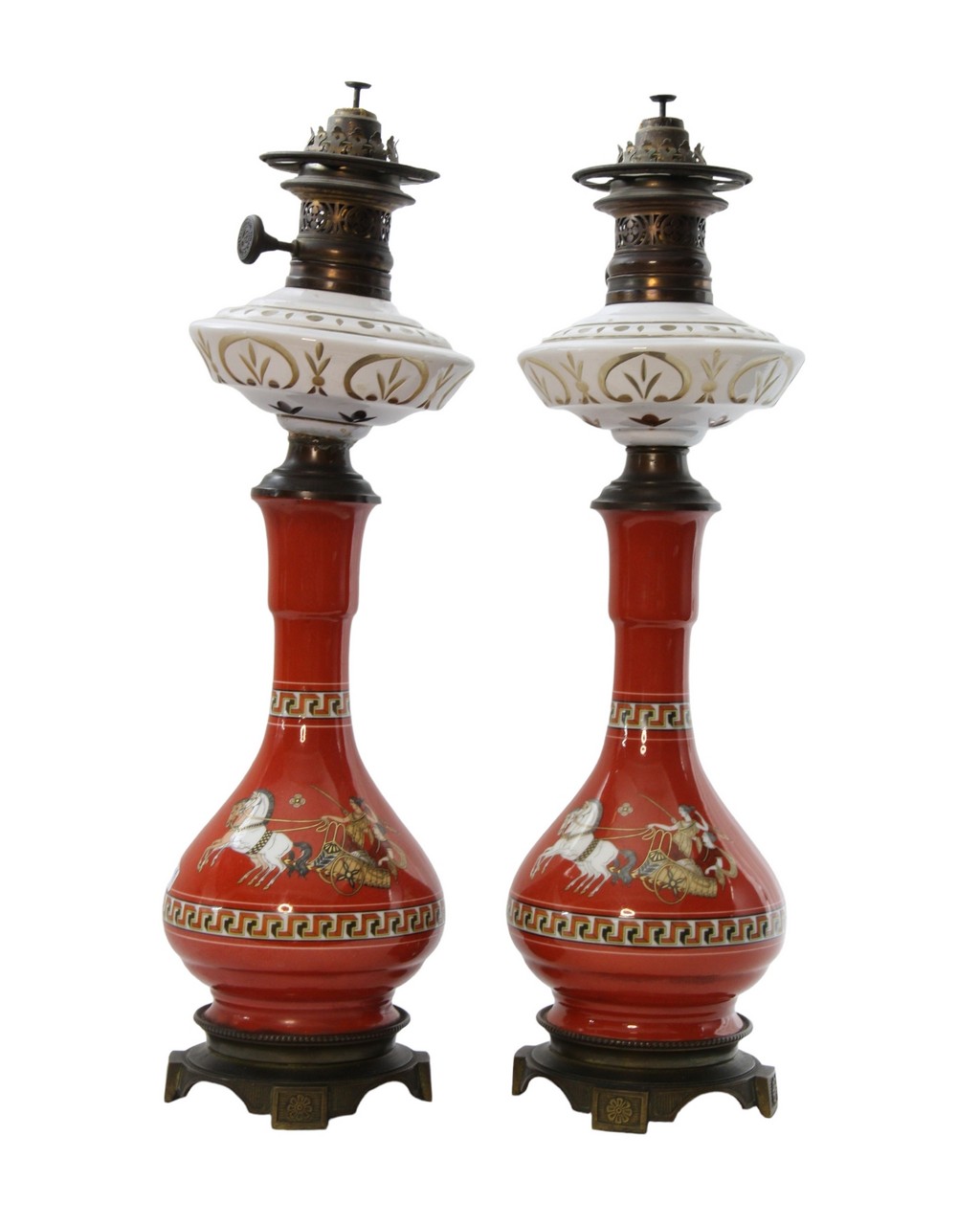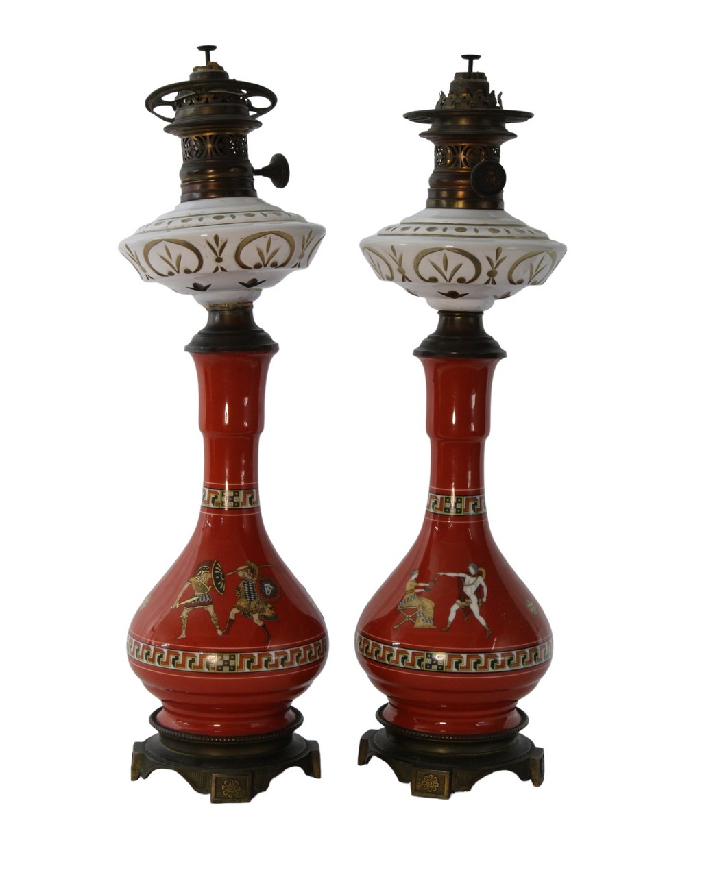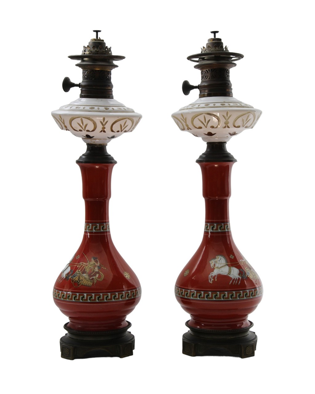 COPPIA LUMI in porcellana a fondo rosso , decorati da figure di antichi greci. XX secolo Napoli. h cm 60 x 18