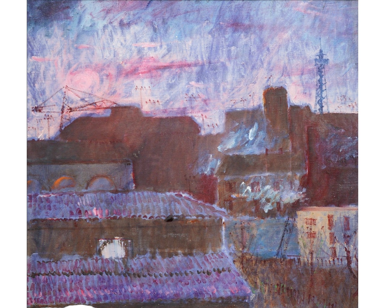 LUISA SIMONE PAVIA 1938 OLIO SU TELA CITTA’ INDUSTRIALE autentica sul retro XX secolo h cm 64 x 69