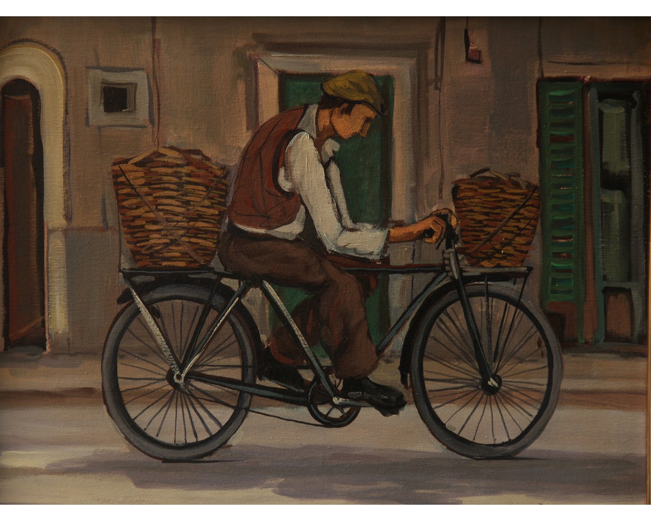 OLIO SU TELA Raff Contadino in bicicletta firmato Giuseppe Marchese autografato sul retro h cm 48 x 58
