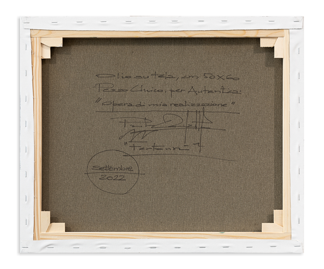 Firma, tecnica, datazione e dichiarazione di autenticità dell'Artista al retro