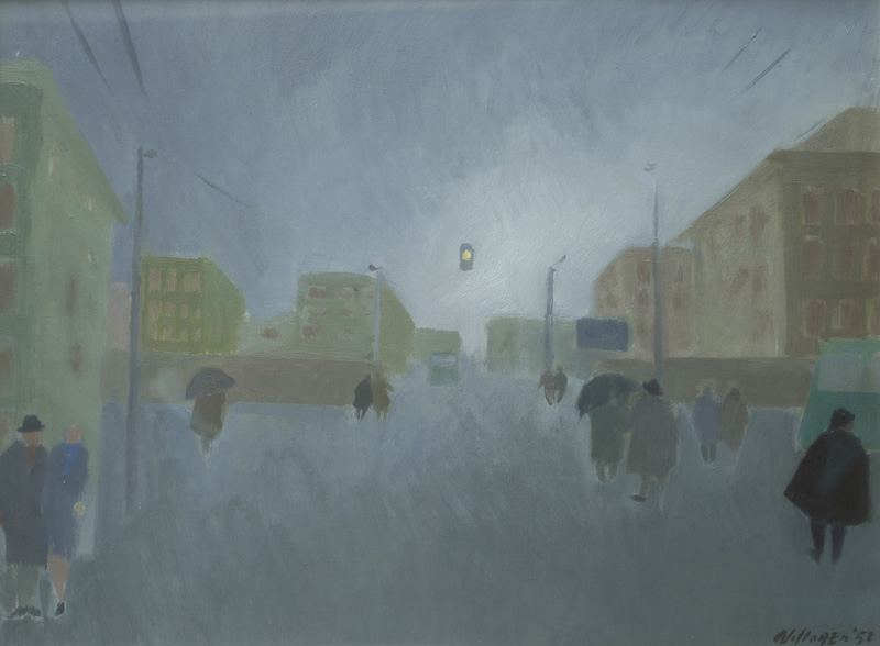 Franco Villoresi (Città di Castello, 1920 - Arezzo, 1975) PIOGGIA, 1952 Olio su compensato, cm. 55,5x42 Firma e data in basso a destra. Sul verso: firma e titolo.