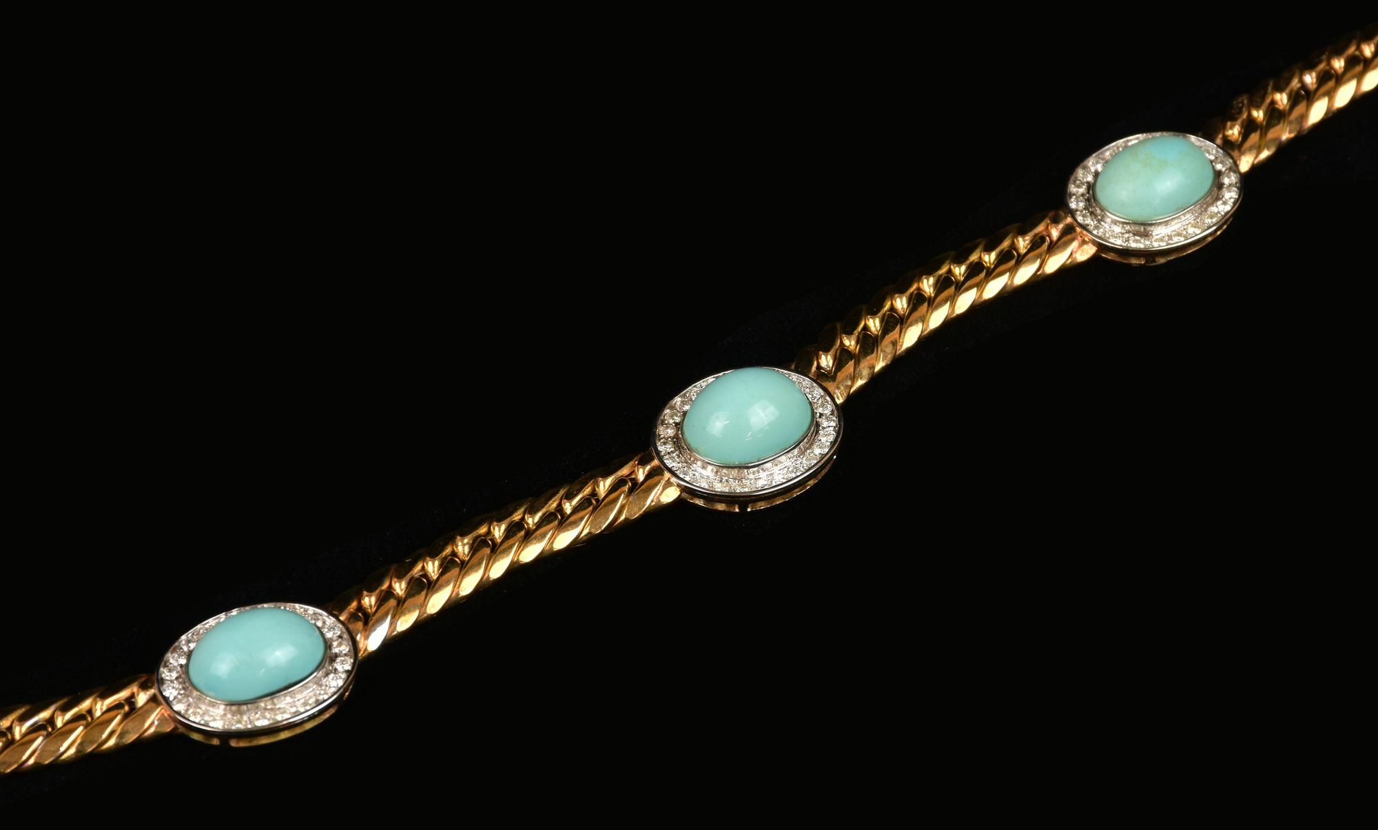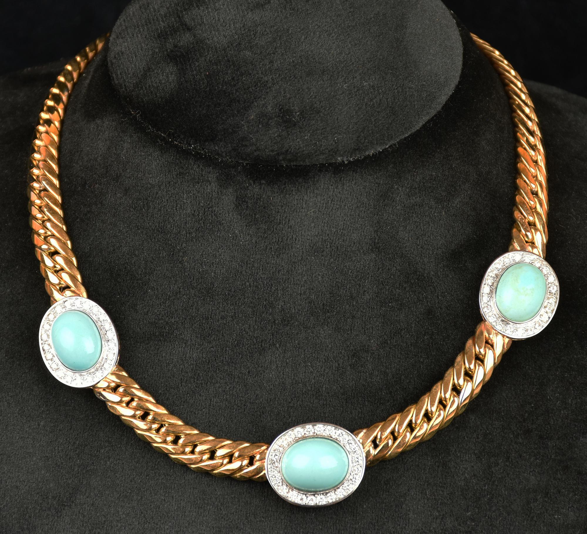 realizzata a maglia groumette in oro giallo, impreziosita da 3 turchesi cabochon contornati da un giro di diamanti di forma rotonda taglio a brillante per ct. 1.30 circa, punzone Missiaglia, 750, lunghezza cm 40, grammi 48 circa