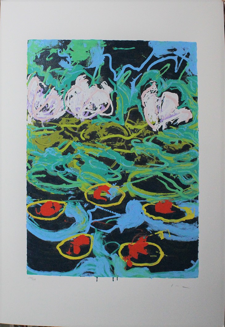 MARIO SCHIFANO, "Gigli d'acqua", 1993, Serigrafia materica su carta, Dim. 70x100, Al fronte: tiratura 174/199 in basso a sinistra, firmato in basso a destra, Opera pubblicata nelle edizioni Torcular