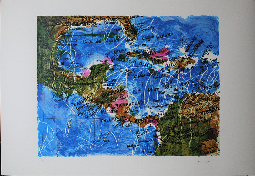 MARIO SCHIFANO, "Veduta (cartina)", Serigrafia materica a smalto su carta, Dim. 70x100, Al fronte: tiratura 160/199 in basso a sinistra, firmato in basso a destra