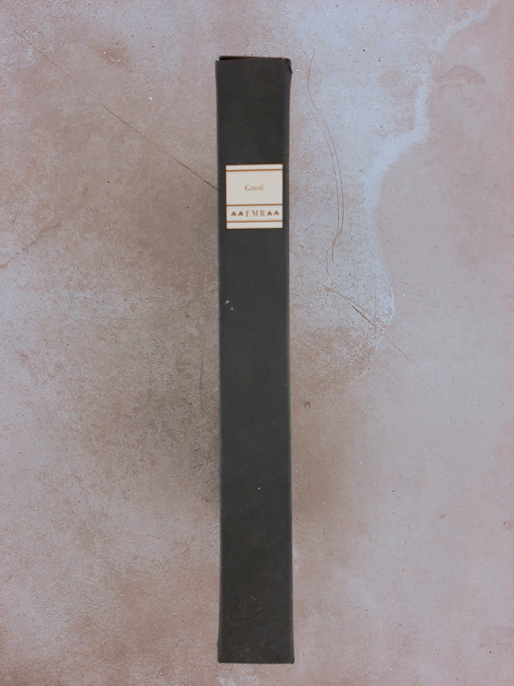 appositamente alla forma tonda nelle Cartiere Milani di Fabriano. Tiratura di 5.000 esemplari numerati in caratteri arabi, esemplare n. 1475. Rilegatura cartonata entro cofanetto