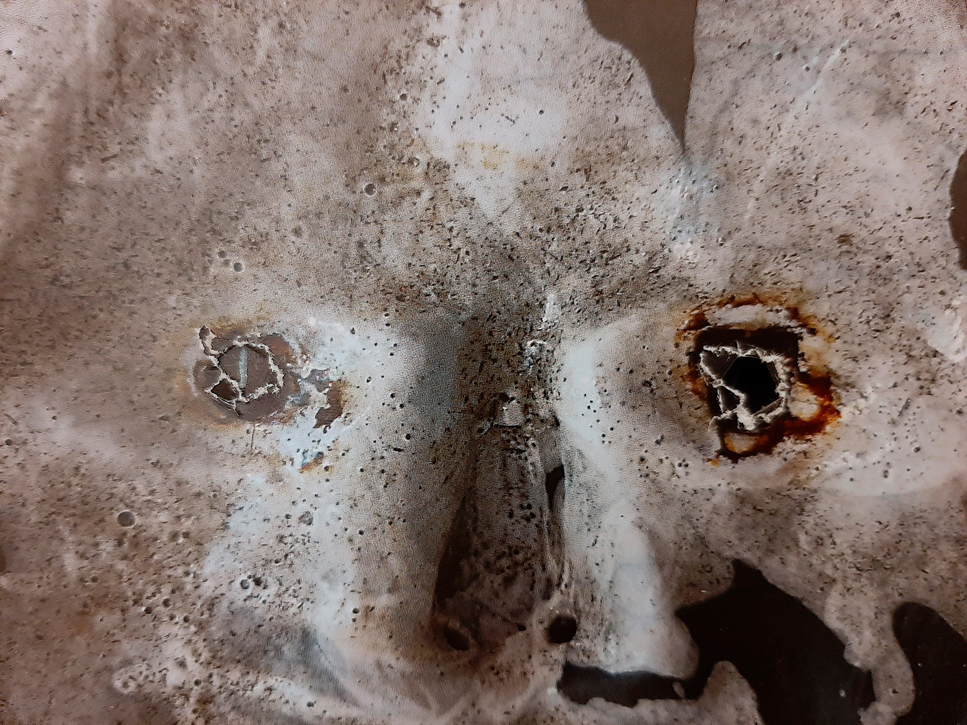 Intervento dell'artista sul catalogo (foratura degli occhi della maschera in quarta di copertina) e matita bianca all'interno, con firma e data 2014, pagine 16