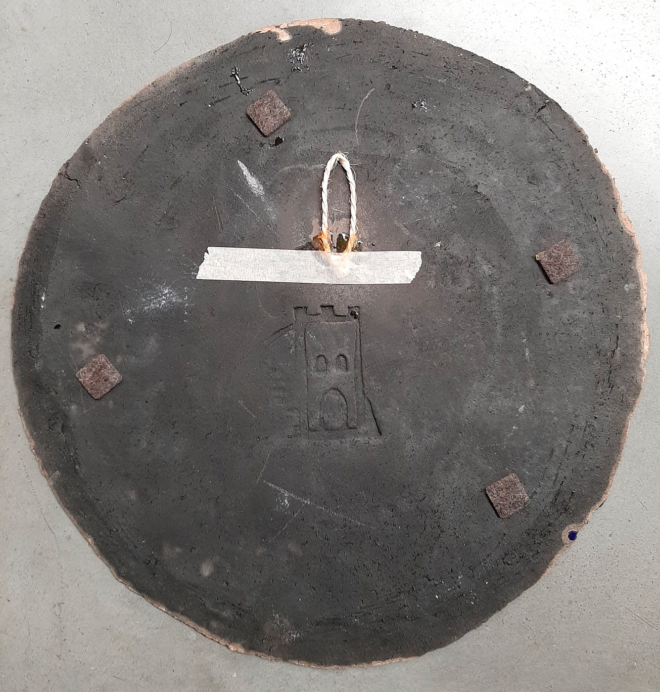 piatto in ceramica raku, opera esposta nella mostra “Terra Cotta Bruno Ceccobelli”, tenutasi a Padova, Galleria La Rinascente, dal 26 giugno al 27 luglio 2020, a cura di Nicola Galvan. Riprodotta in catalogo. Al retro dell'opera logo della torre di Todi della famiglia Ceccobelli