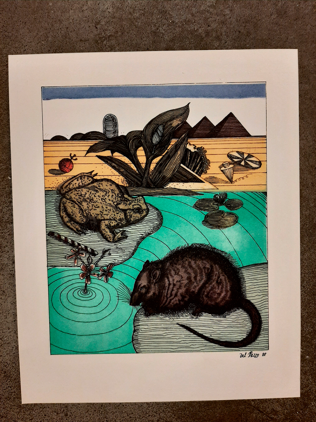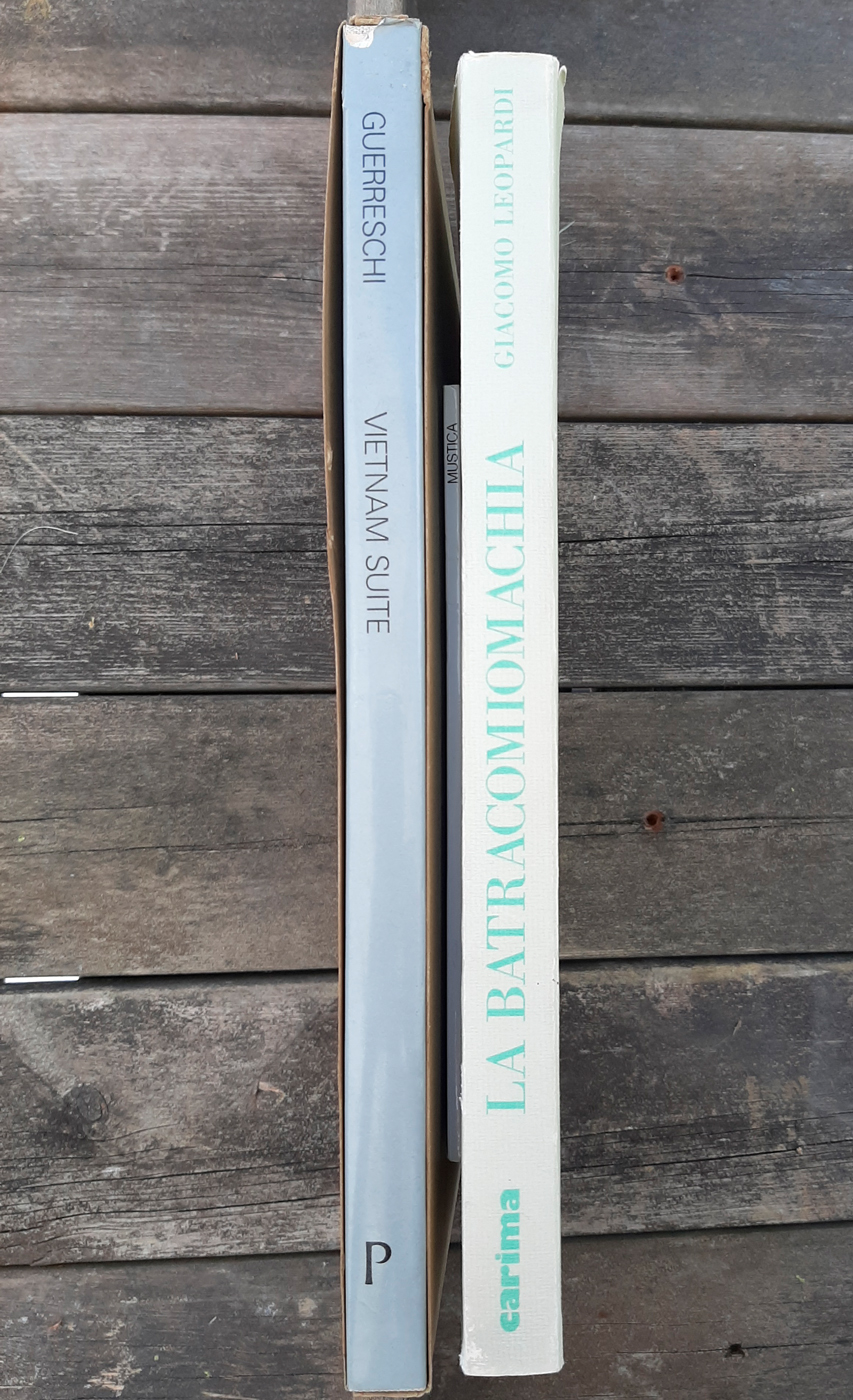 Libro contenente la traduzione in italiano di Giacomo Leopardi della Batracomiomachia (La battaglia delle rane e dei topi), con un saggio di Edoardo Sanguineti e immagini di Lucio del Pezzo. Contiene una litografia firmata sulla lastra di Lucio Del Pezzo del 1988. Copia di pregio in quanto autografata da Lucio del Pezzo.