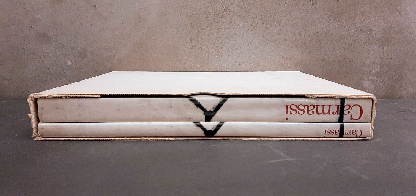 Doppio catalogo monografico dedicato ad Arturo Carmassi, entro cofanetto, a cura di Giovanni M. Accame. Con introduzione di Michele Greco, numerose illustrazioni a colori e in bianco e nero. Copertina cartonata con sovraccoperta, pagine 71 e pagine 176