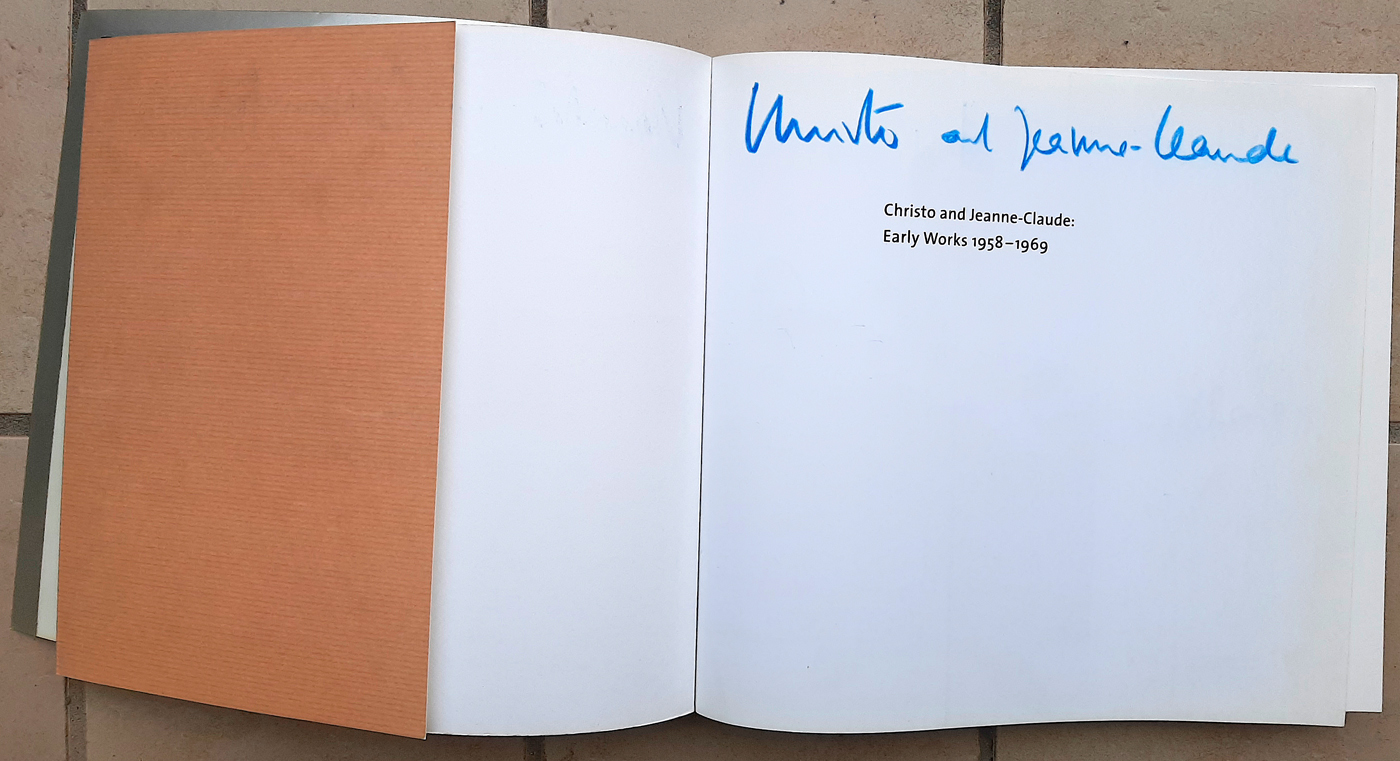 Catalogo monografico dedicato alla coppia di artisti Christo e Jeanne-Claude. Brossura con alette e copertina in metacrilato serigrafata, pagine 276. Copia di straordinario pregio per presenza dell'autografo di entrambi gli artisti