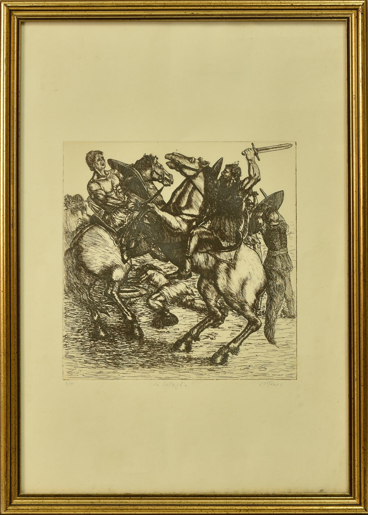 Leonardo Lo Staino LA BATTAGLIA acquaforte su carta, battuta cm 24,5x23,5, su...