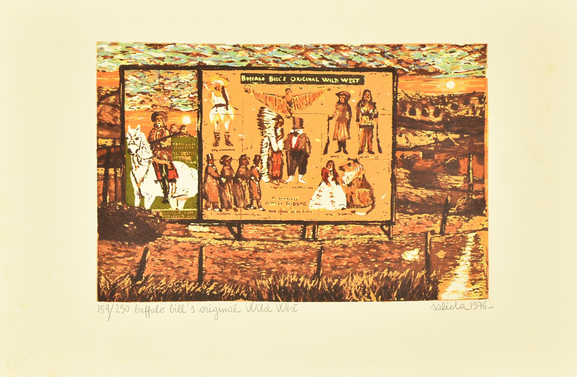 - Antonio Saliola, Buffalo Bill's original Wild West (Il Bicentenario degli U.S.A.), litografia su carta, cm 32x47, firma, titolo, data e timbro a secco Giulio Bolaffi Editore; l'opera presenta lievi macchie puntiformi di umidita'