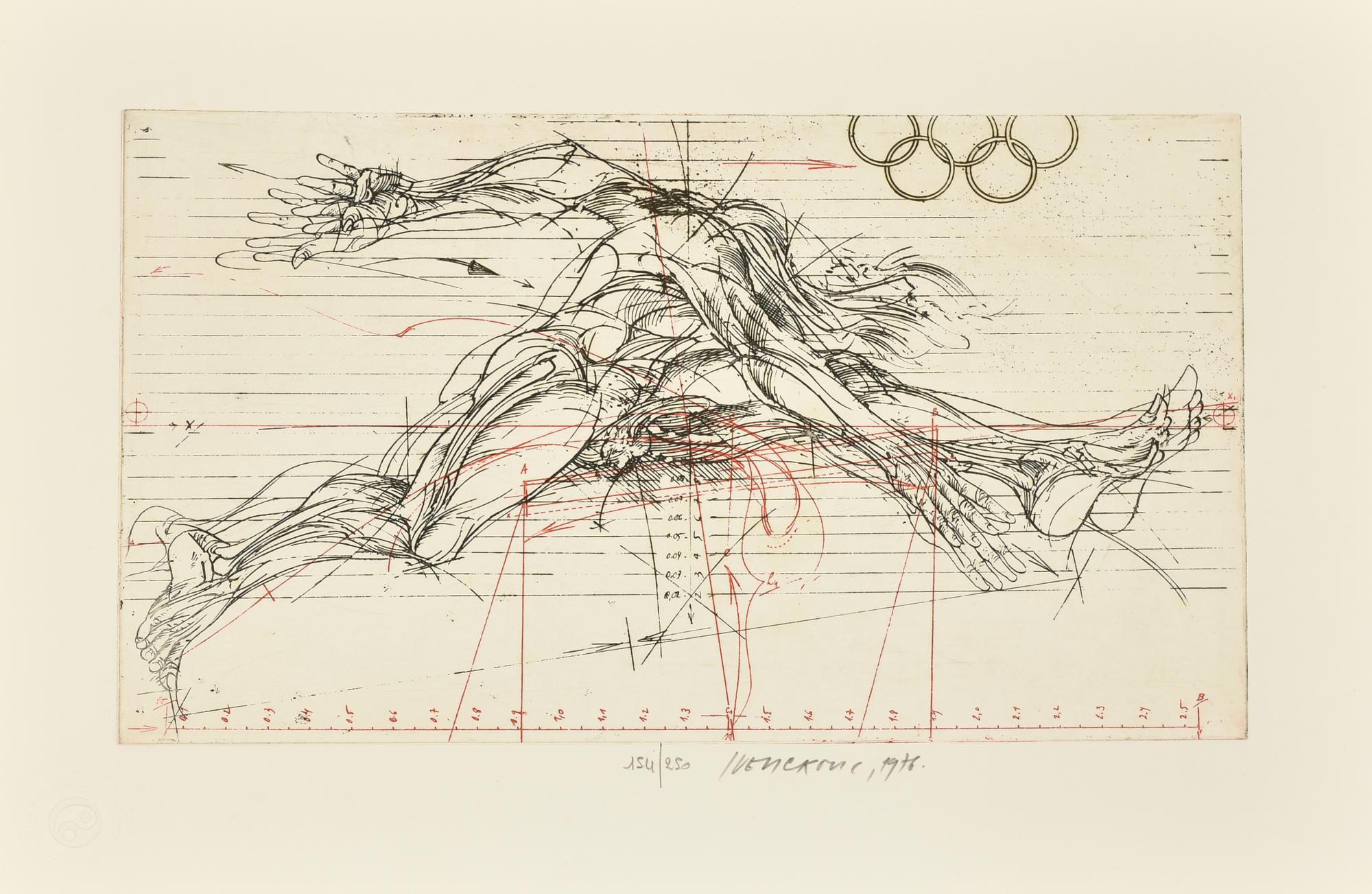 - Vladimir Velickovic, Le Olimpiadi, incisione su carta, battuta cm 21x35,5, su foglio cm 31x45, firma, data e timbro a secco Giulio Bolaffi Editore