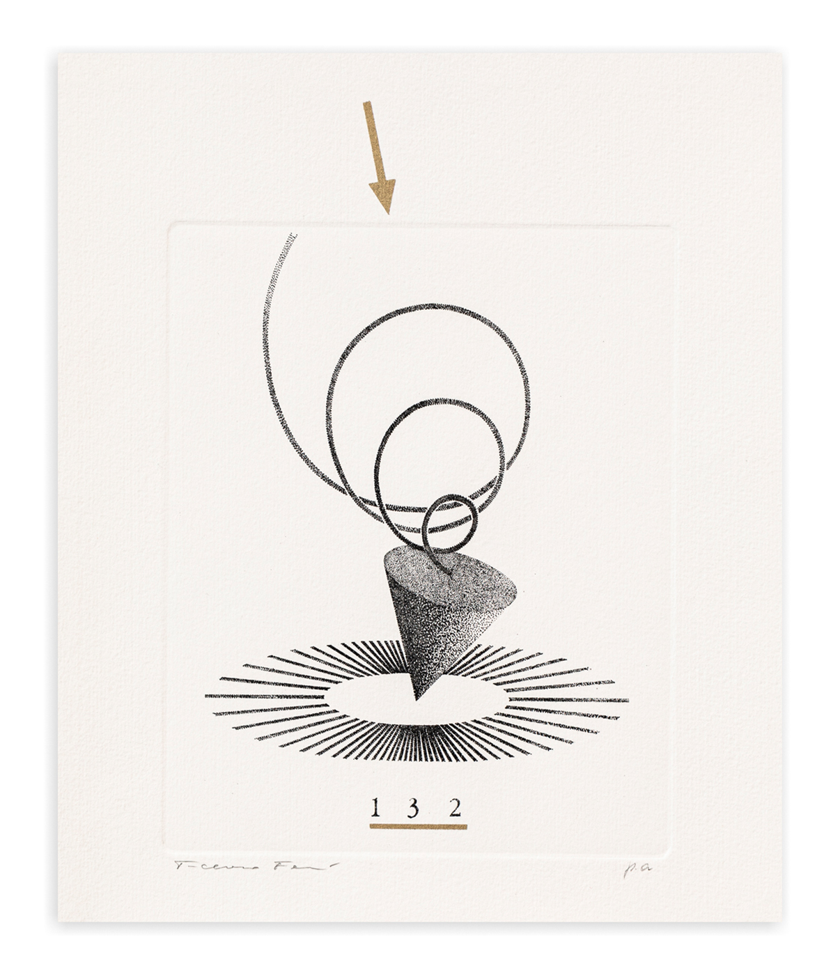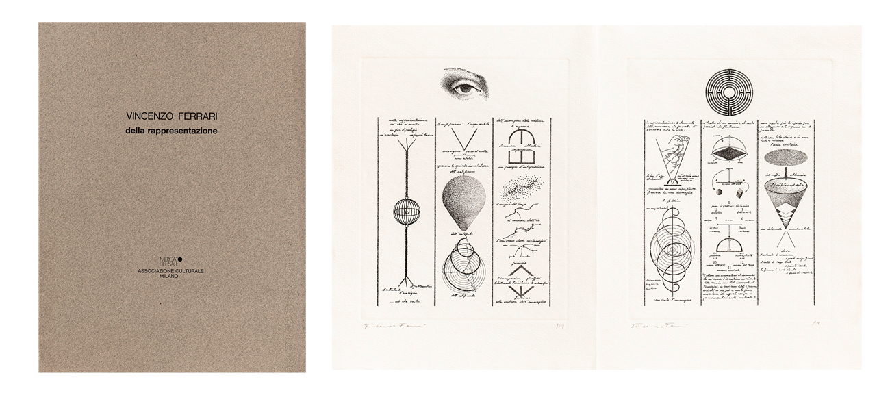 Cartella contenente un'acquaforte pieghevole di Vincenzo Ferrari recante firma e numerazione (Esemplare P.A.) a matita al fronte