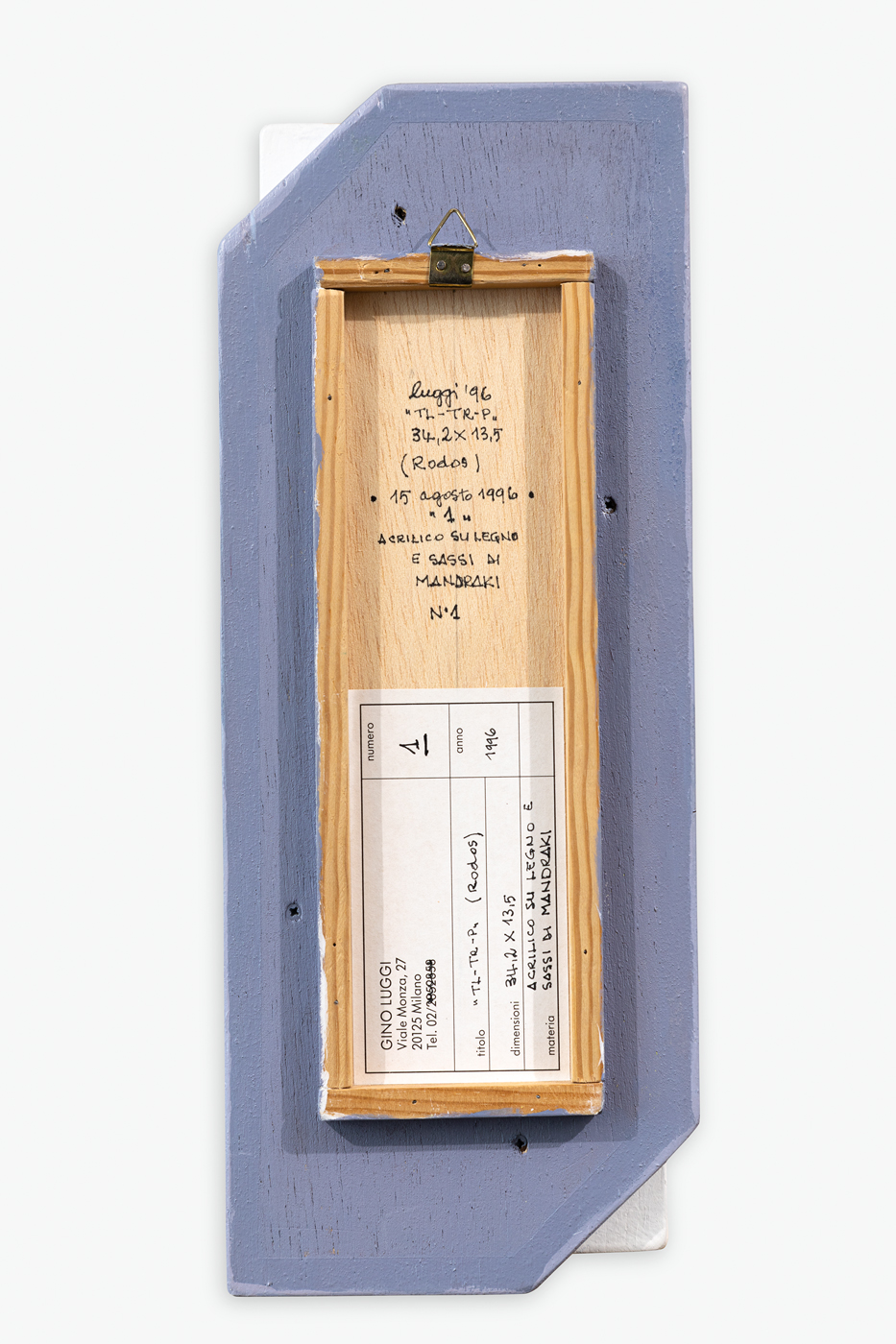 Etichetta dell'Artista con caratteristiche tecniche dell'opera al retro della tavola protettiva