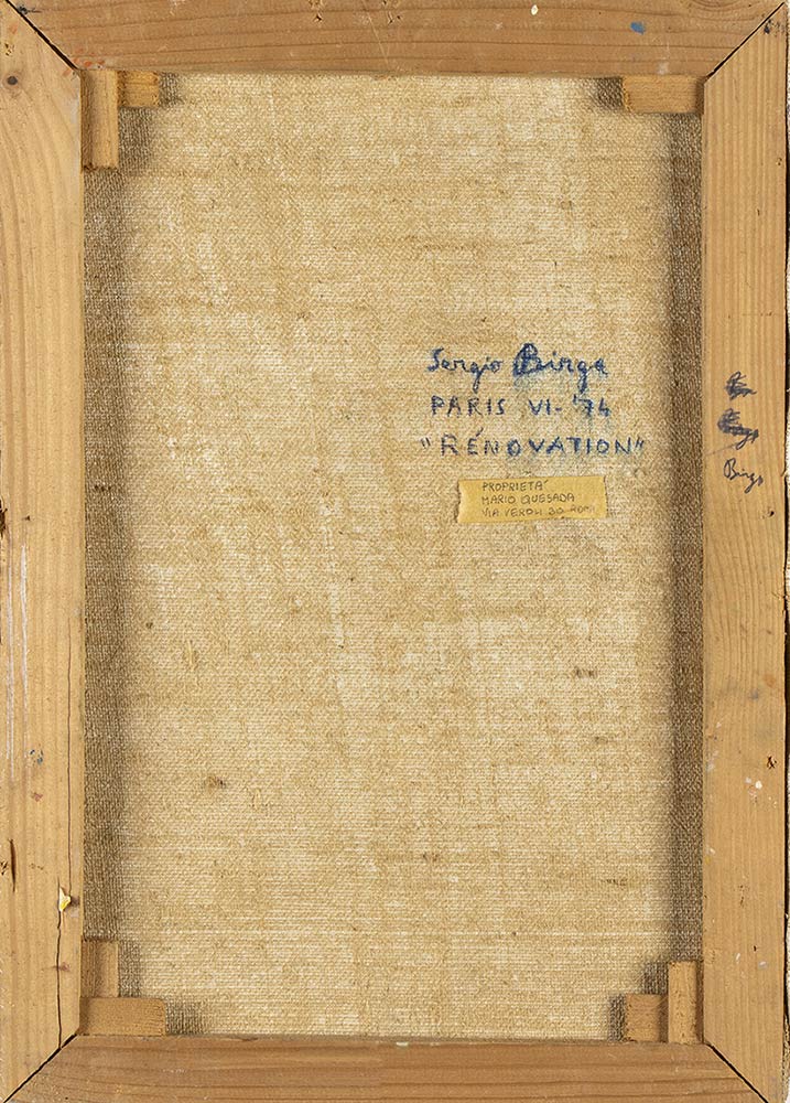 Firma e data al centro a destra: Birga 74. Al retro firmato, datato e titolato: Sergio Birga, Paris VI - ‘74, Rénovation