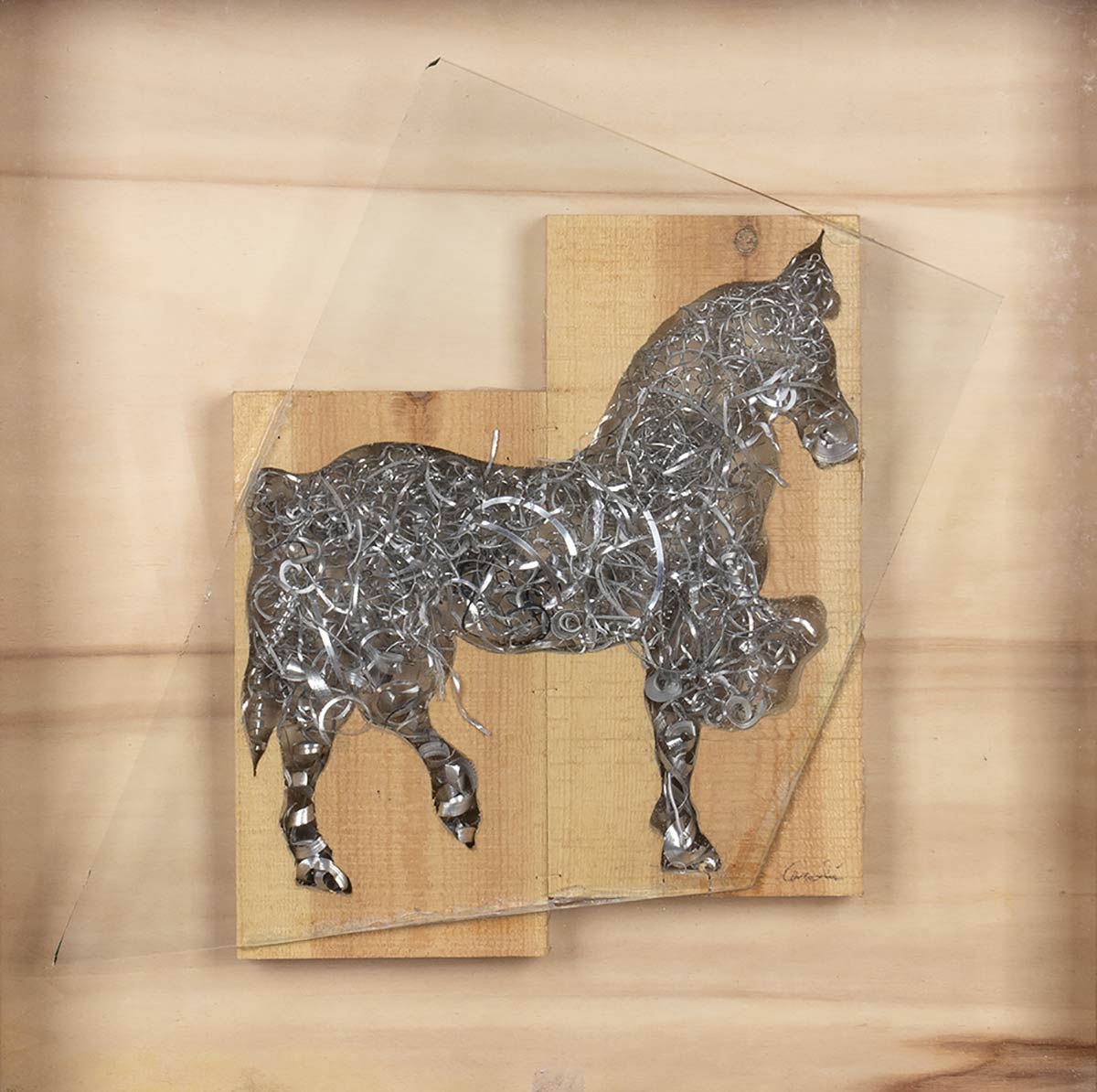 Scultura in legno e alluminio entro teca di legno e vetro, 53,5 x 53,5 cm