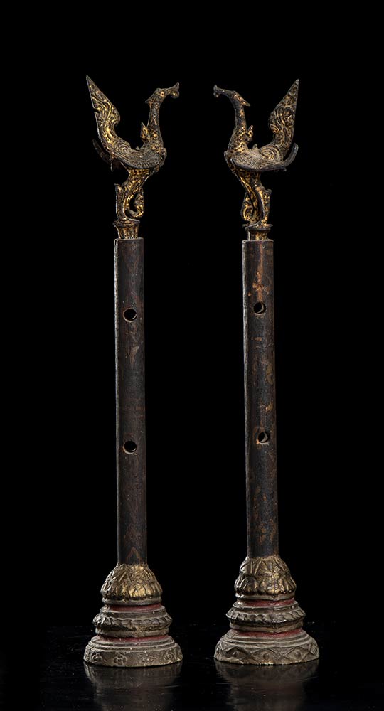 DUE PICCOLE COLONNE IN LEGNO PARZIALMENTE DORATO CON FINALE A UCCELLO - Thailandia, XIX secolo: