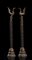 DUE PICCOLE COLONNE IN LEGNO PARZIALMENTE DORATO CON FINALE A UCCELLO
