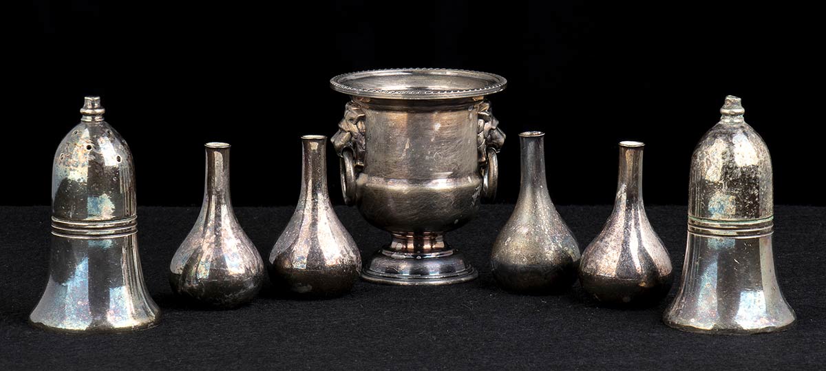 Lotto di set con segnaposto, sale e pepe in lega argentata