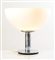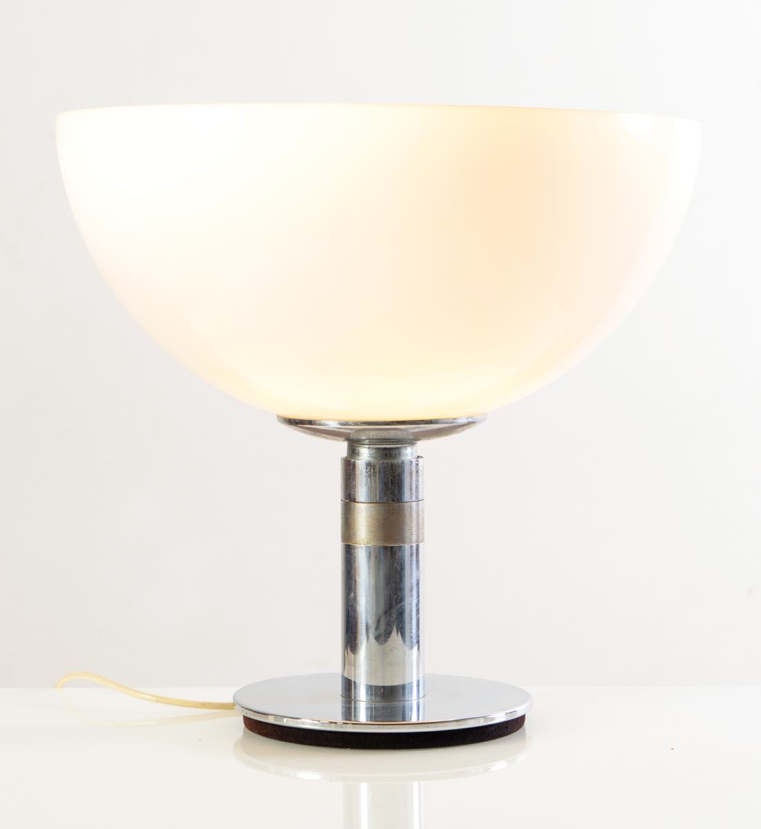 Base a sezione circolare, struttura in metallo cromato, diffusore in vetro opalino bianco, H cm 46 – diametro max cm 49.5