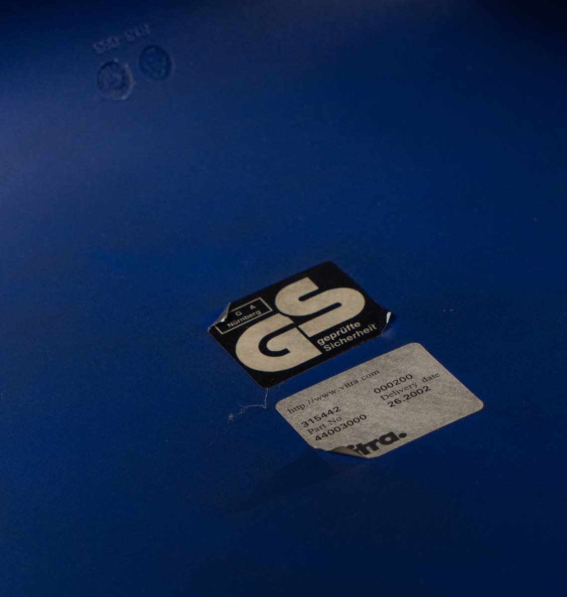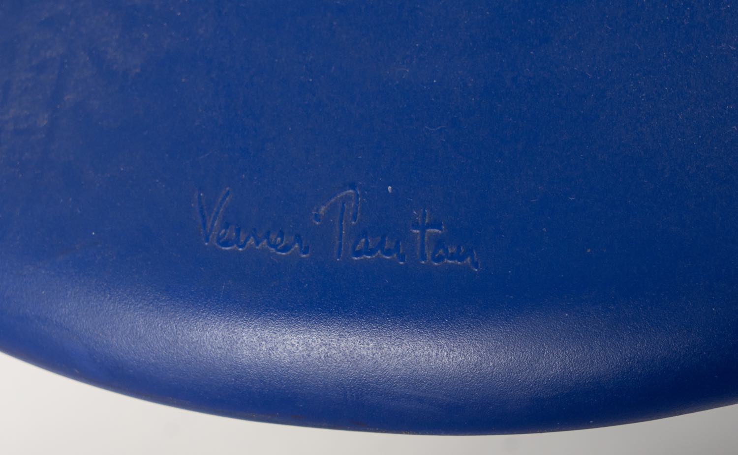 Struttura in plastica abs blu, reca sotto la seduta etichetta della manifattura e iscrizione impressa “Vitra”, presenta alla base firma incisa del designer “Verner Panton”, H cm 82x50x60 – H seduta cm 43