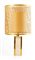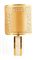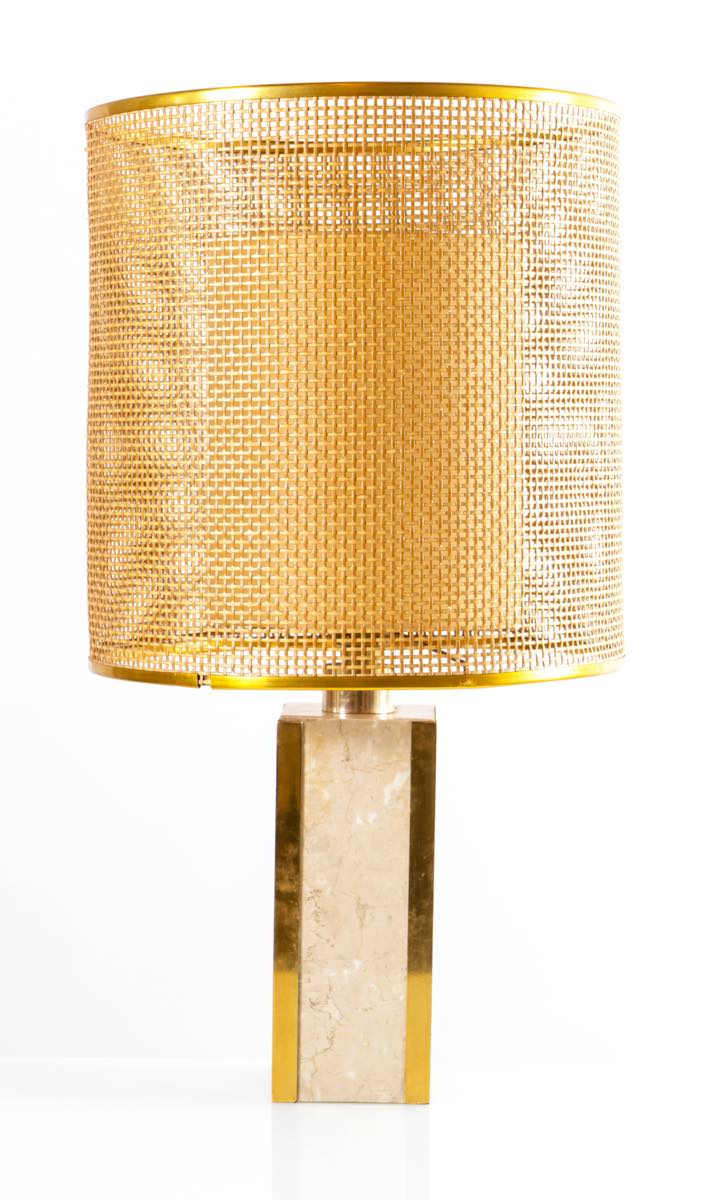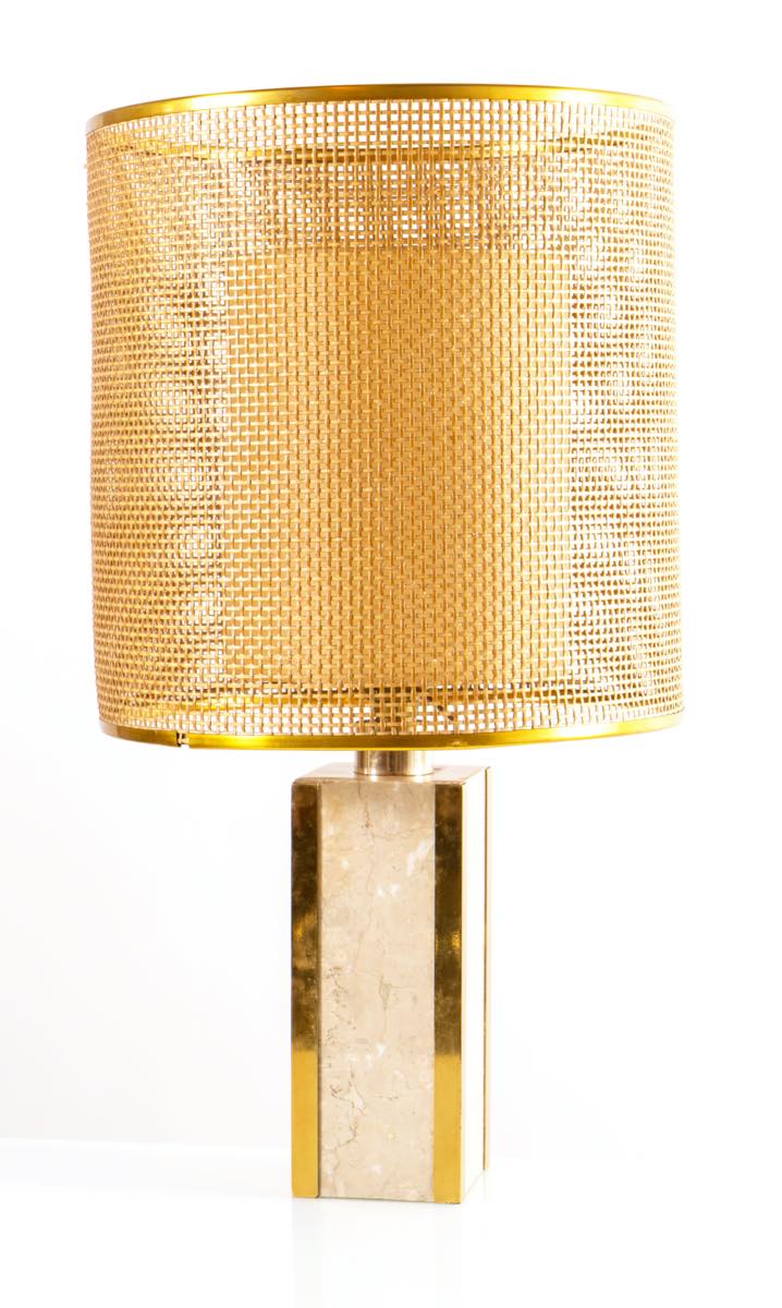 Base a sezione quadrata in travertino con profili in ottone dorato, completa di doppio paralume con parte interna in tessuto e parte esterna in rattan, H base cm 30x13x13 – H max cm 77 – diametro max cm 43.5 (usure)