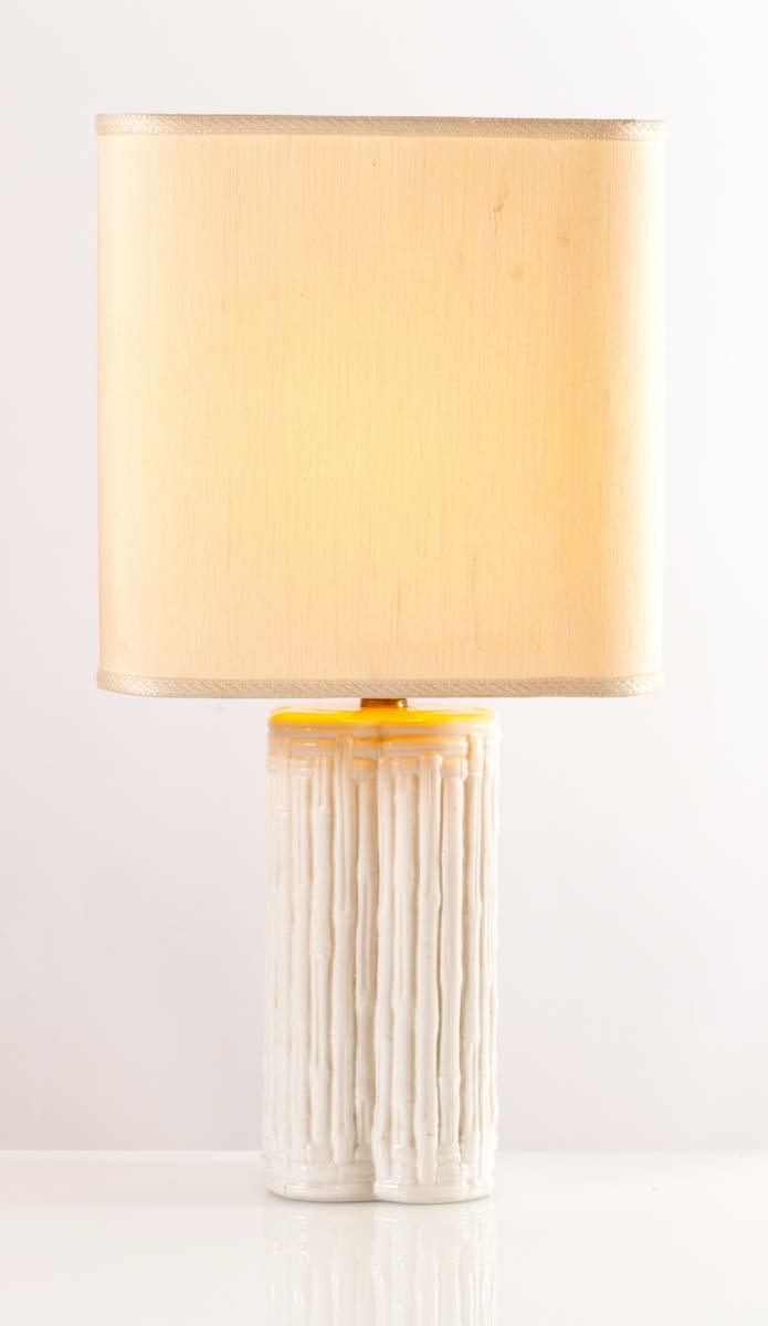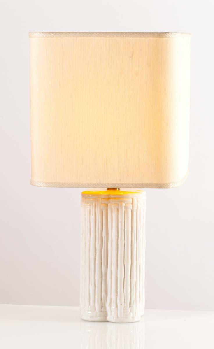 Base quadrilobata in ceramica lavorata a bambù in rilievo, completa di paralume in tessuto avorio, H base cm 31x15x15 – H max cm 71x36x36 (usure)