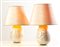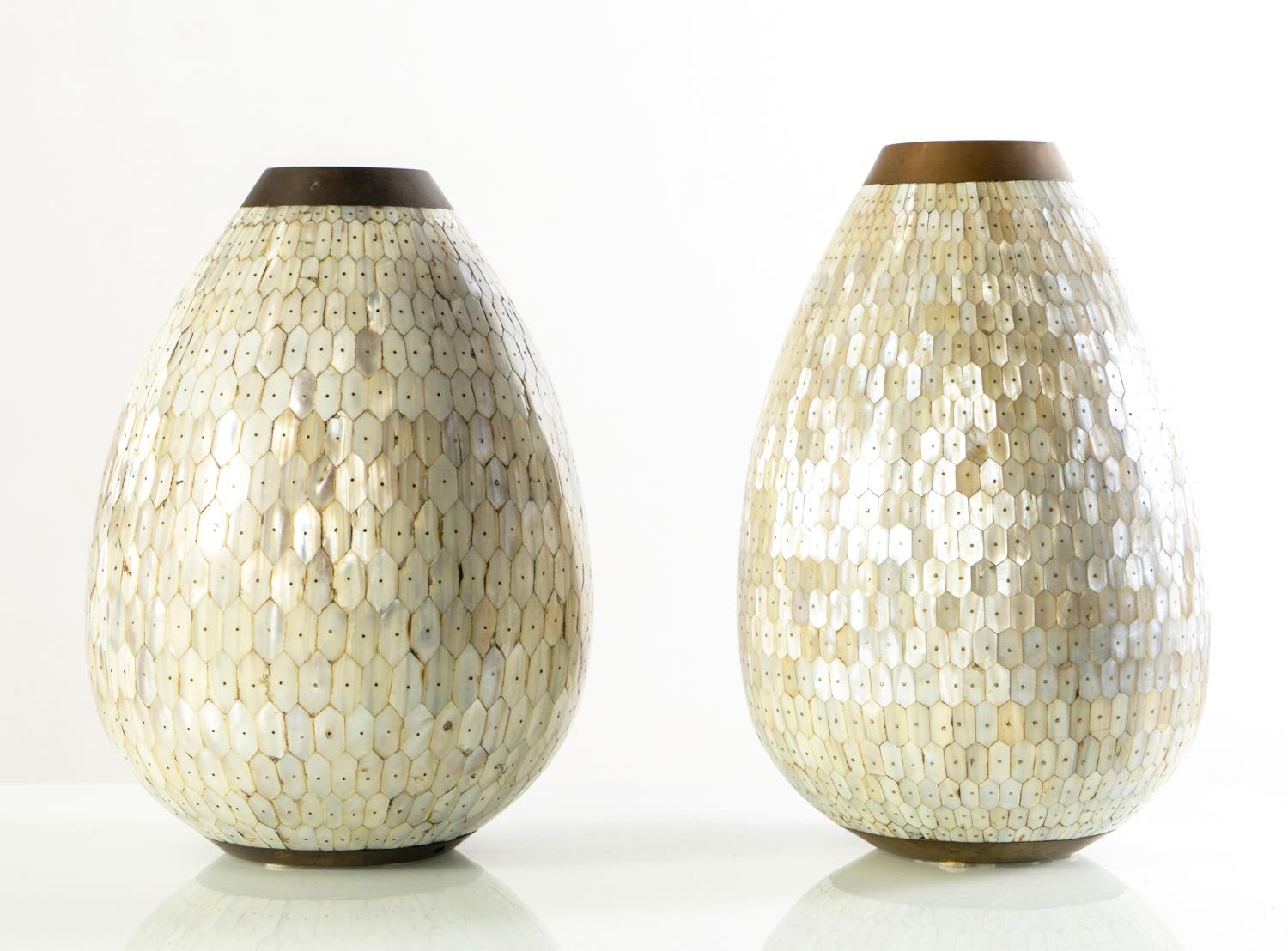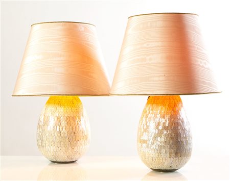 Corpo a uovo in ottone con superficie rivestita da tessere di madreperla naturale, complete di paralume in tessuto, H tot cm 63 – diametro max cm 46 (lievi usure)