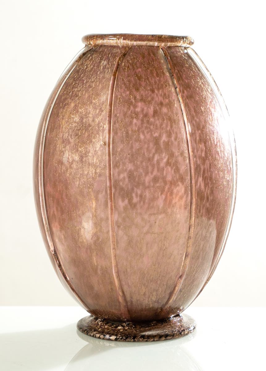 Corpo a sezione circolare, superficie in avventurina decorata con cordoli in vetro trasparente applicati a caldo, poggiante su piede circolare, H cm 36 – diametro max cm 26