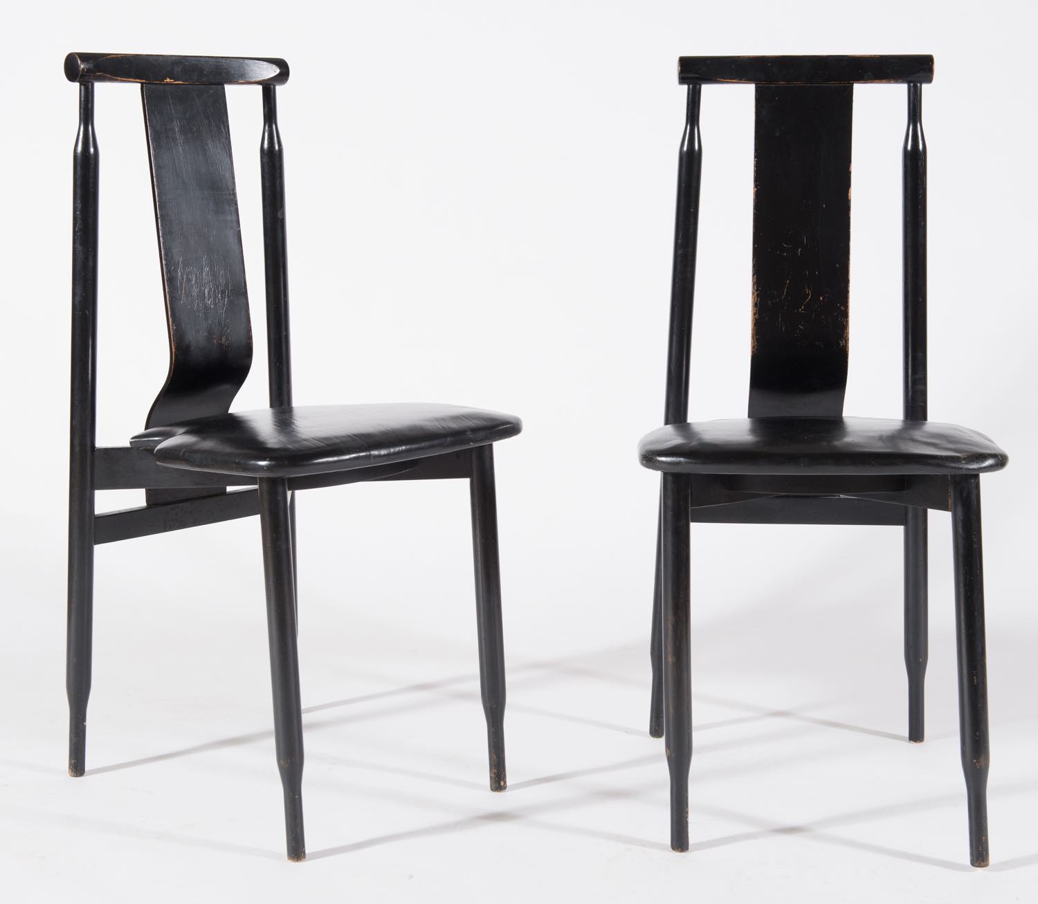 In legno laccato nero con sedili imbottiti e rivestiti in pelle nera, H cm 86.4x40x45, H seduta cm 46 (difetti)