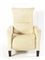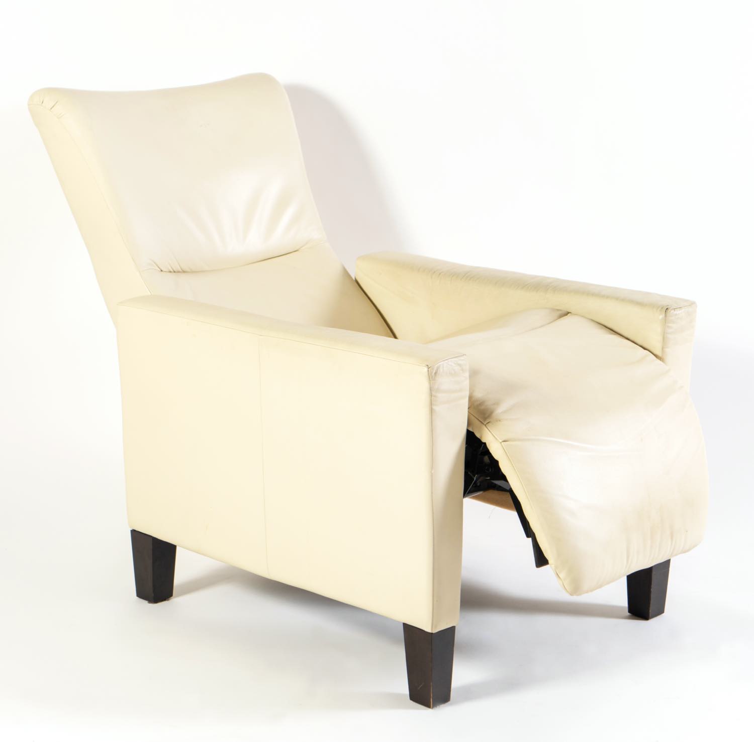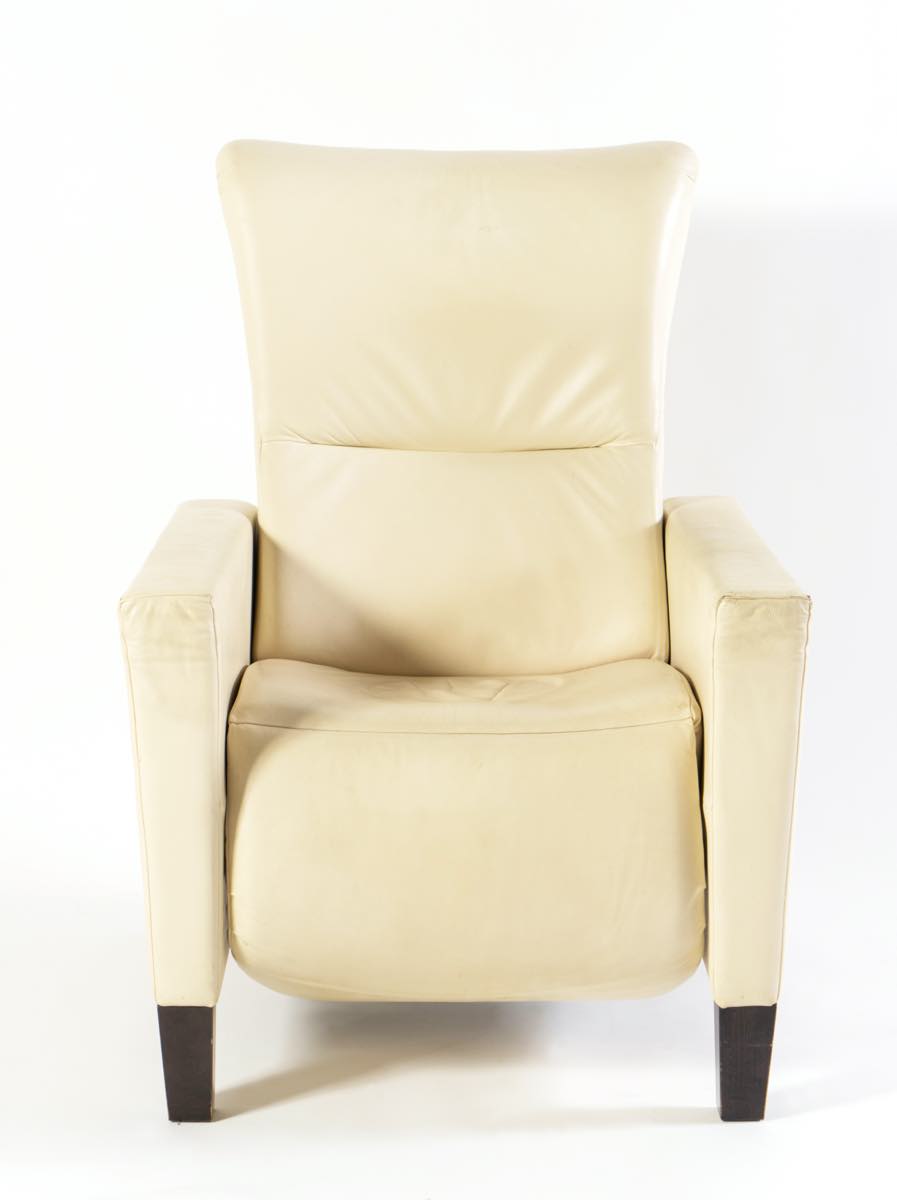 Struttura imbottita rivestita in pelle color avorio, poggiapiedi estraibile, reca etichetta della manifattura sul fianco sinistro, H cm 108x76x80 – H seduta cm 50