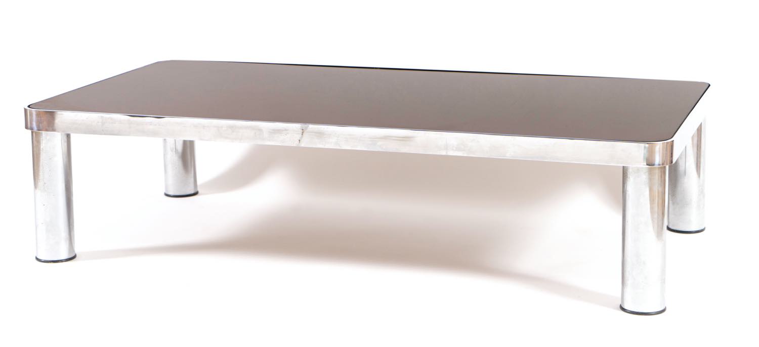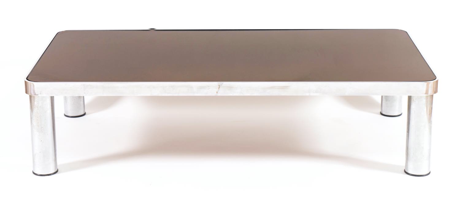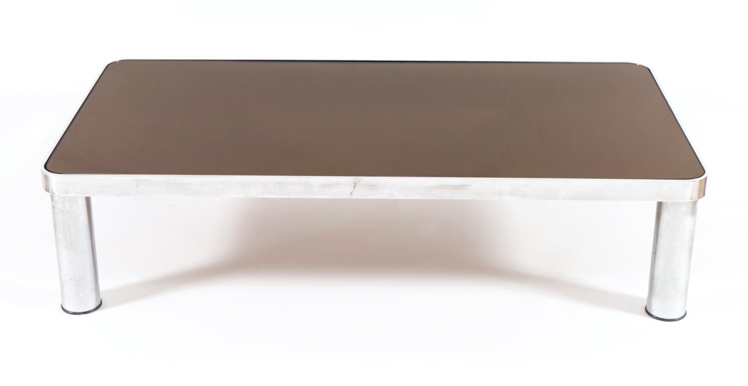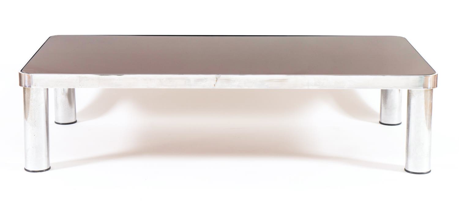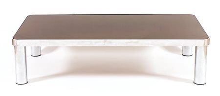 Struttura in metallo cromato con angoli stondati, piano incassato in vetro fumé specchiato, H cm 37x149x79 (lievi usure)