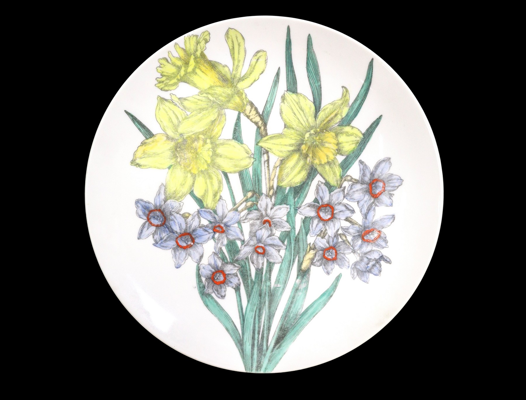 Piero Fornasetti - Piatto in porcellana bianca, serie limitata e numerata (n°10) intitolata "Fiori", 60's Diametro cm 24 Sul fondo bianco spiccano un mazzo interamente decorati con l'utilizzo del colore giallo, verde e rosso e viola.