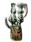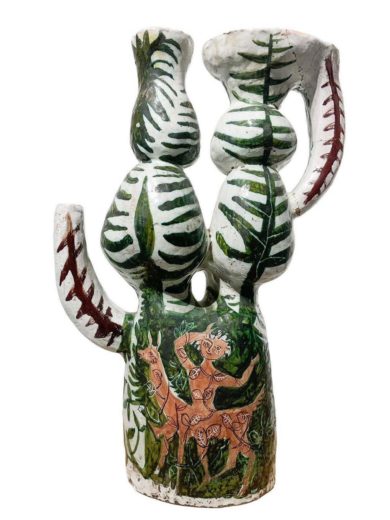 Alessio Tasca - Tavolo scultura in ceramica maiolicata, 1954 H cm 62, base cm 14X22, piano cm 52x37. Decoro policromo nei toni del verde e del bruno manganese di gusto informale, raffiugrante scenario agreste. Firmato Tasca 54. Presenti incollature.