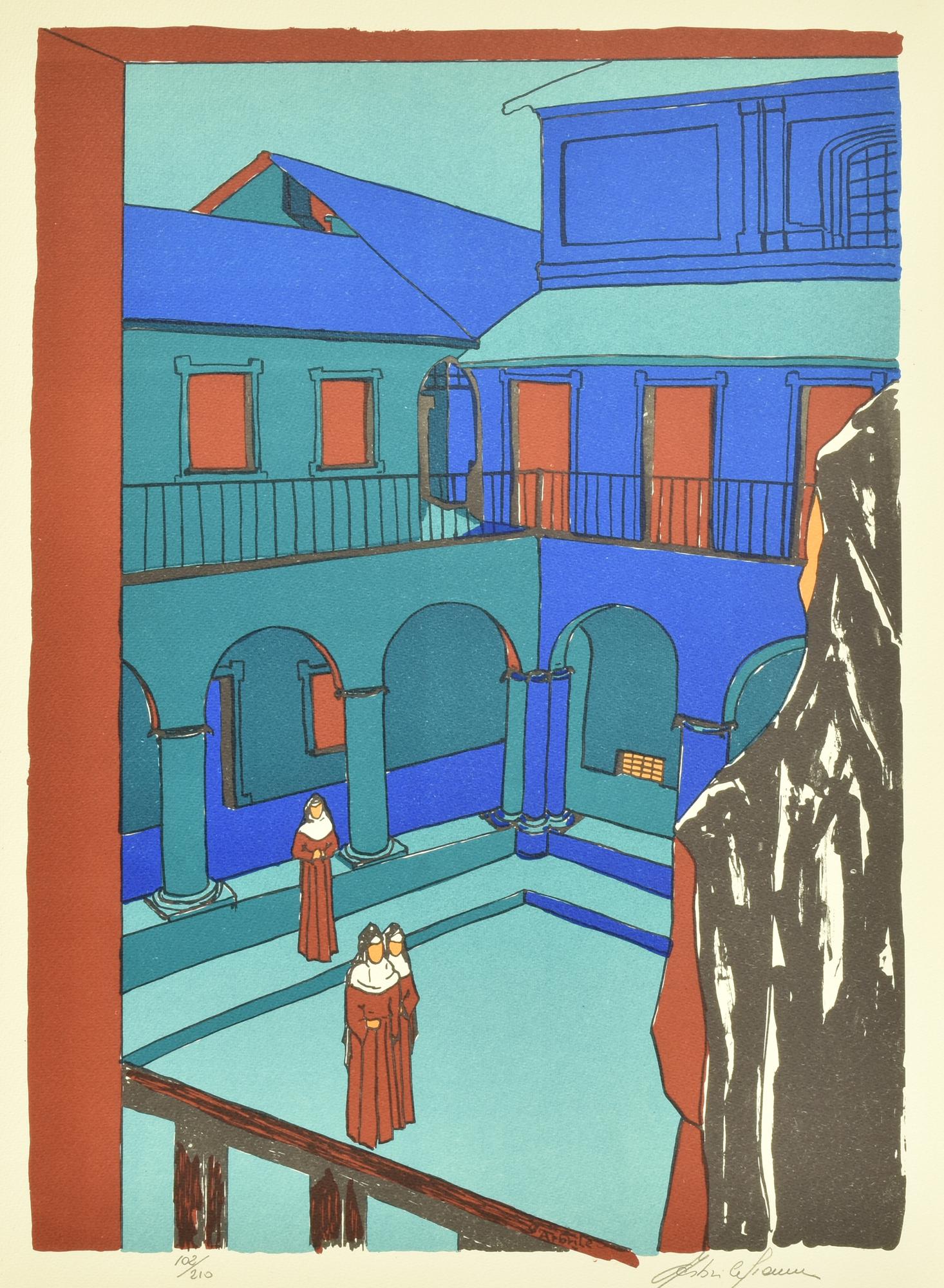Gianni Arbrile L'USCITA DAL CONVENTO litografia su carta, cm 46,5x34; es....